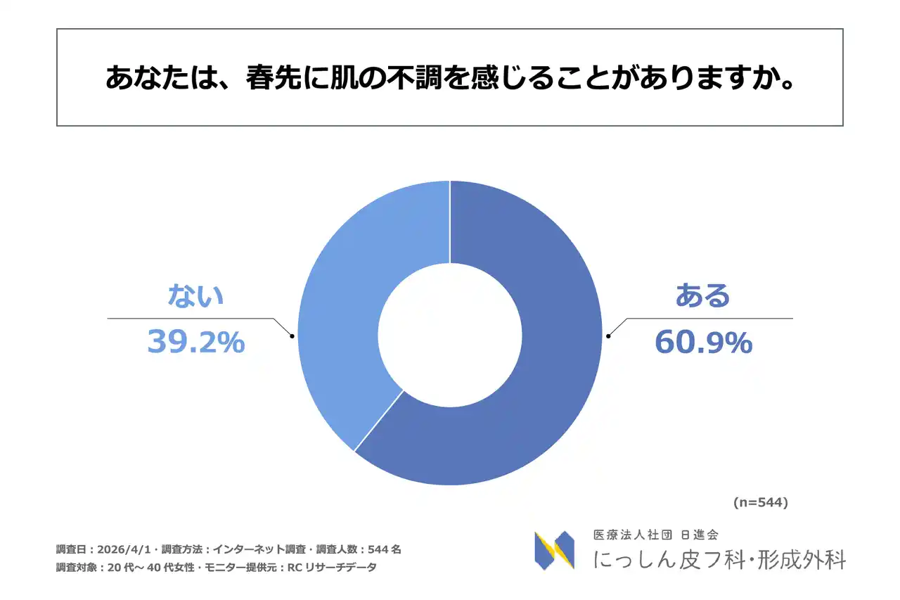 医療法人社団 日進会 にっしん皮フ科・形成外科(所在地:埼玉県さいたま市、理事長:平岩 亮一)は、20代~40代女性を対象に「春先の肌不調が対人行動に及ぼす影響に関する調査」を実施しました。この調査から、20代~40代女性の春先における肌不調の実態や、それに伴う対人関係における行動、イベント時の写真撮影への意識などが明らかになりました。