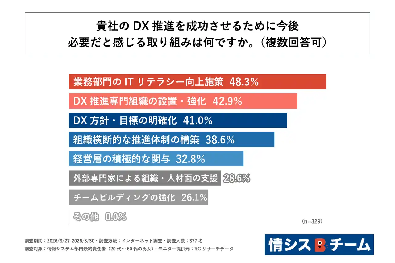 調査の最後、自社のDX推進において課題を抱える情報システム部門の最終責任者を対象に「自社のDX推進を成功させるために今後必要だと感じる取り組みは何か」を尋ねる設問への回答では、1位が「業務部門のITリテラシー向上施策」で48.3%、2位が「DX推進専門組織の設置・強化」で42.9%、3位が「DX方針・目標の明確化」で41.0%という結果になりました。この結果から、自社のDX推進を成功させるために今後必要だと感じる主な取り組みは、「業務部門のITリテラシー向上施策」や「DX推進専門組織の設置・強化」であることがわかりました。 |