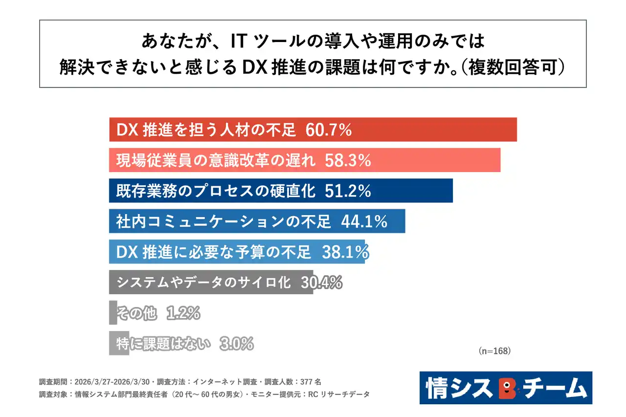 情報システム部門のITスキルとチームづくりの両面から支援する「情シスBチーム」を運営するジー・ブーン株式会社(本社:東京都江東区、代表取締役:後藤 稔行)は、情報システム部門の最終責任者(20代~60代の男女)を対象に「企業のDX推進におけるIT依存実態に関する調査」を実施しました。この調査から、情報システム部門の最終責任者における、自社のDX推進の課題の実態やITツールの導入・運用だけではDX推進を達成できないと感じる理由、DX推進を成功させるために必要な取り組みなどが明らかになりました。