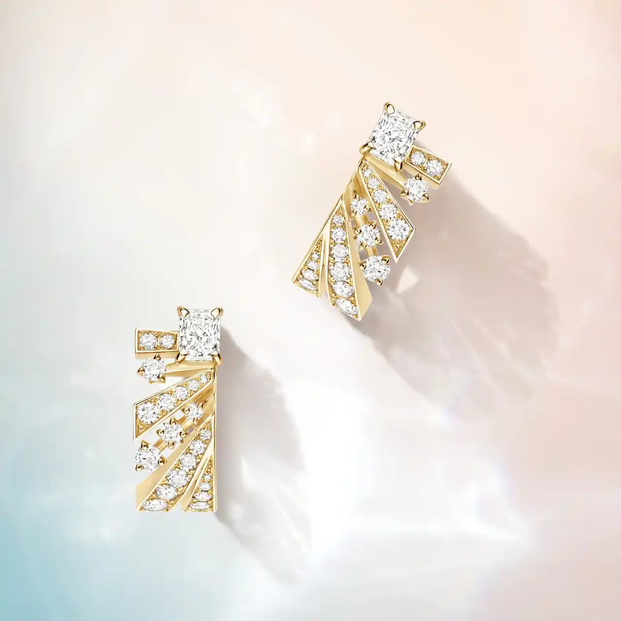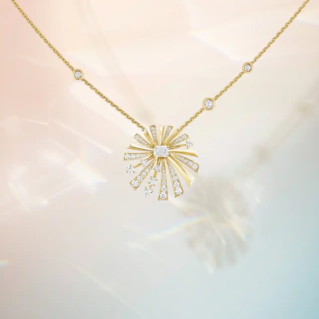 温かい朝日にインスパイアされたこの作品は、様々なボリュームと角度の光線が広がり、中央の0.5カラットの放射状カットダイヤモンドから光が溢れ出しています。ホワイトゴールドとイエローゴールドの組み合わせ、グラフィカルなライン、パヴェ、そしてチェーンのダイヤモンドが光とコントラストの遊びを強化しています。 |