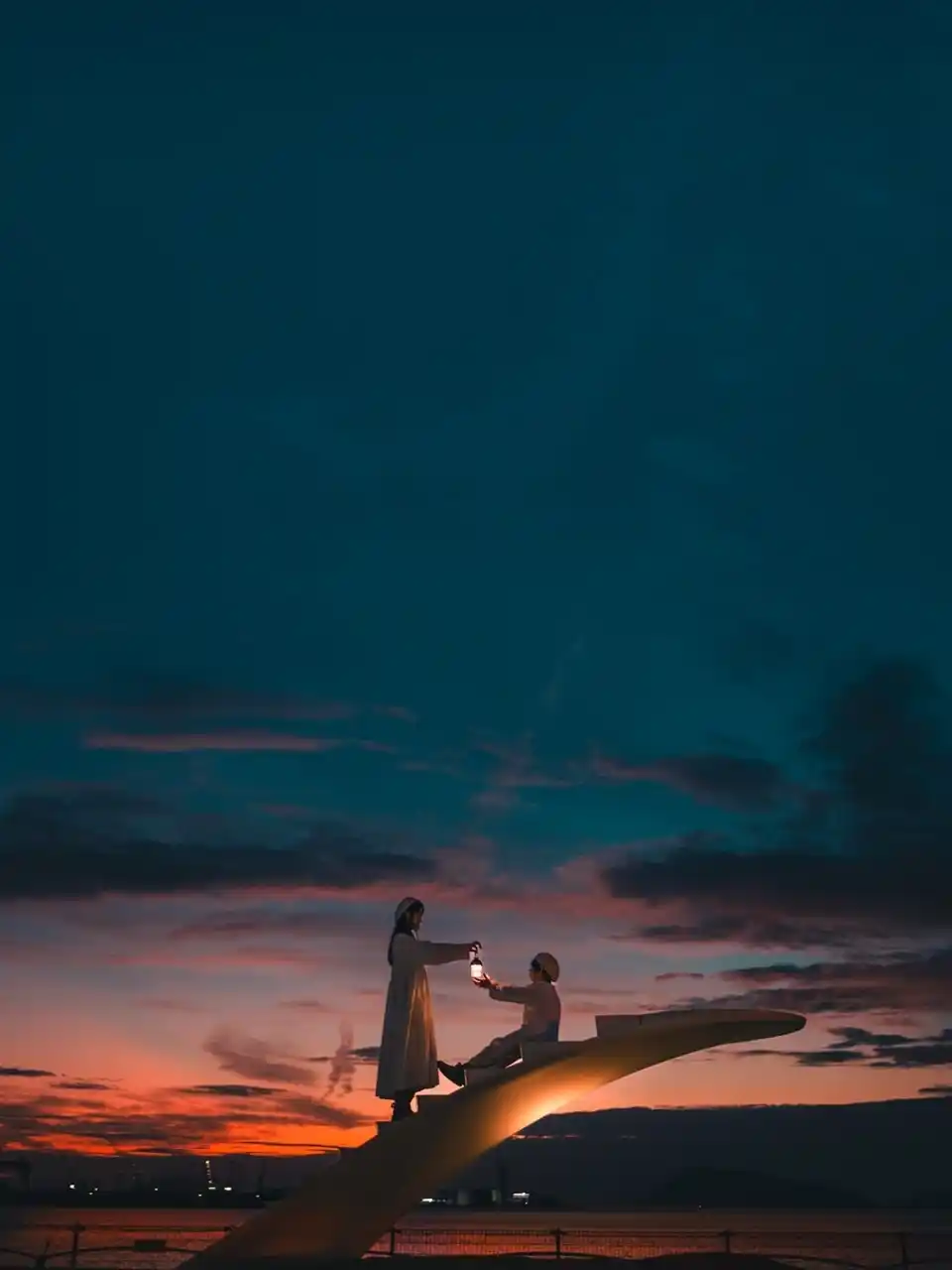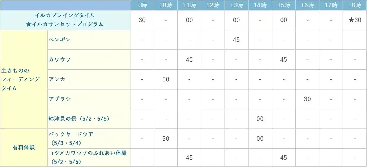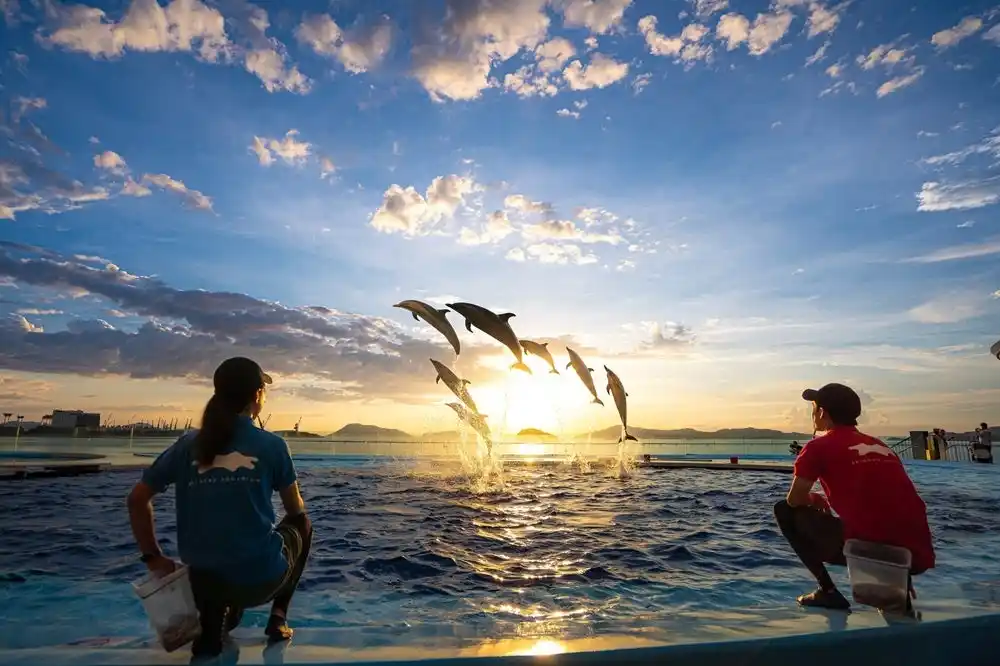 夜の水族館では、館内の水槽照明が深い青色に変化し、幻想的な雰囲気を演出します。夕暮れ時に開催するサンセットプログラムでは、黄金色に染まる空を背景にイルカのシルエットが浮かび上がる、まるで絵画のような景色をご覧いただけます。 |