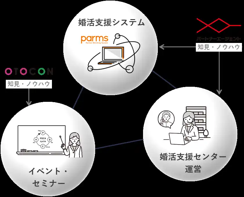 当社は官民一体となって、地方創生や少子化対策を行うことが持続可能な社会の実現につながると考え、当社結婚相談所が有する知見やノウハウを可能な限り、地方の活性化のために生かしていただければと考えております。このため、当社結婚相談所を支える独自開発のマッチングシステムと同等程度の機能を有する「parms」を多くの地方自治体に提供させていただいております。また、これに加えて近年では、婚活支援センターの運営や各種イベント・セミナーの受託も行っております(地方自治体向け3Dオペレーション)。 |