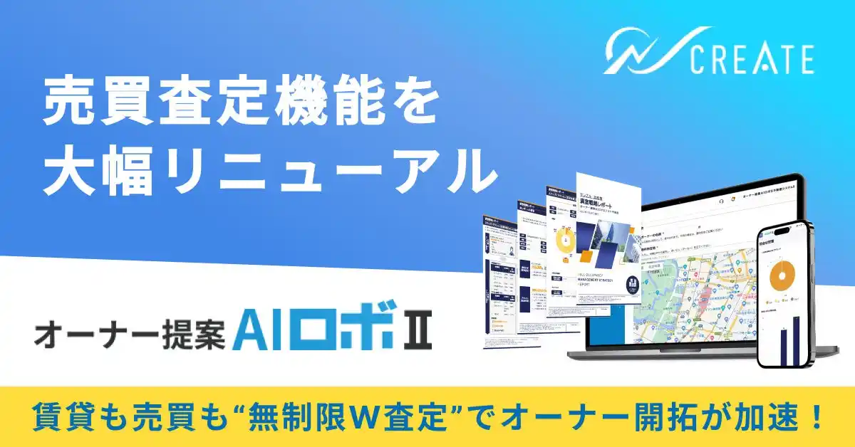 不動産テックを推進する日本情報クリエイト株式会社(本社:宮崎県都城市、代表取締役社長:辻村 都雄、以下「日本情報クリエイト」証券コード:4054)は、不動産テック事業を展開する独立系スタートアップのStudio LOC(スタジオ エルオーシー)合同会社(本社:東京都台東区、代表社員:長田 幸洋、以下「Studio LOC」)との共同開発により制作した、賃料査定・空室対策提案ツール「オーナー提案AIロボII」の売買査定機能が2026年4月21日(火) に大幅リニューアルをしました。これにより、1つのシステムで賃料査定と売買価格査定の両方(以下「W査定」)を、月1万円から回数無制限※で行うことが可能となりました。 |