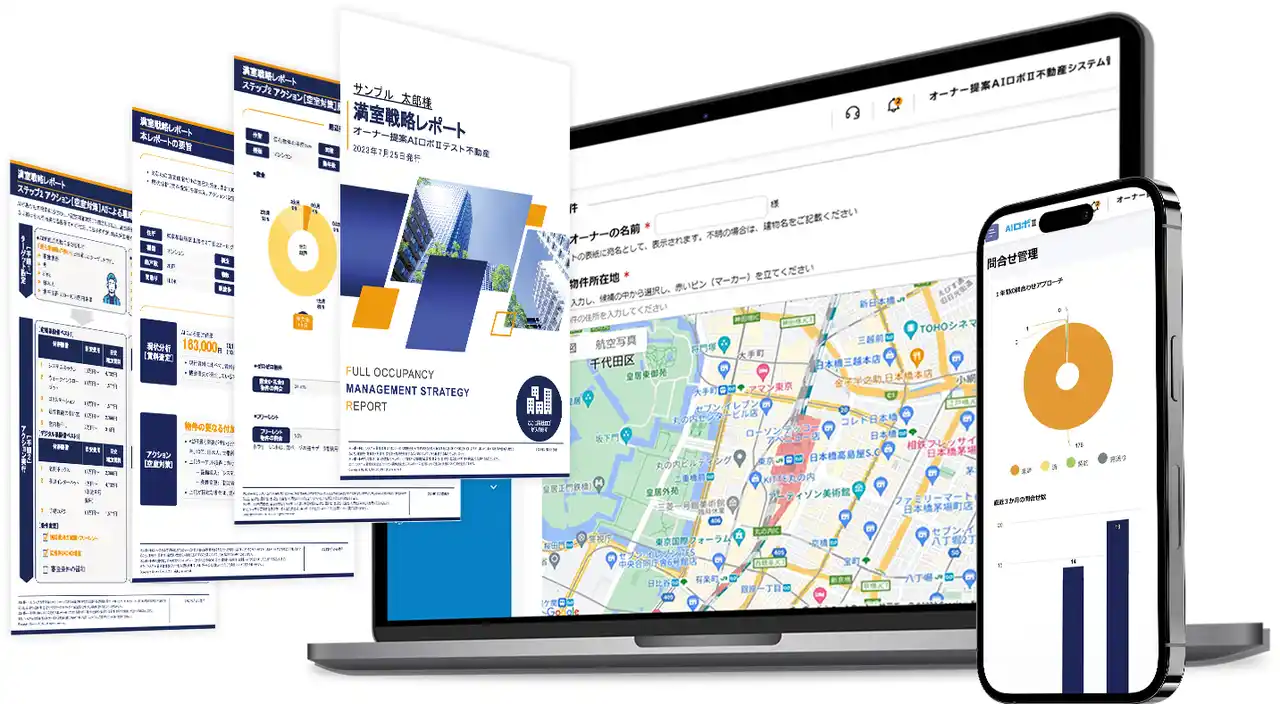 「オーナー提案AIロボII」とは、賃貸住宅ごとに異なる高度な「満室戦略レポート」をWEB上で作成でき、高度なAI賃料査定と空室対策を論理的に行える賃料査定・空室対策提案ツールです。 |