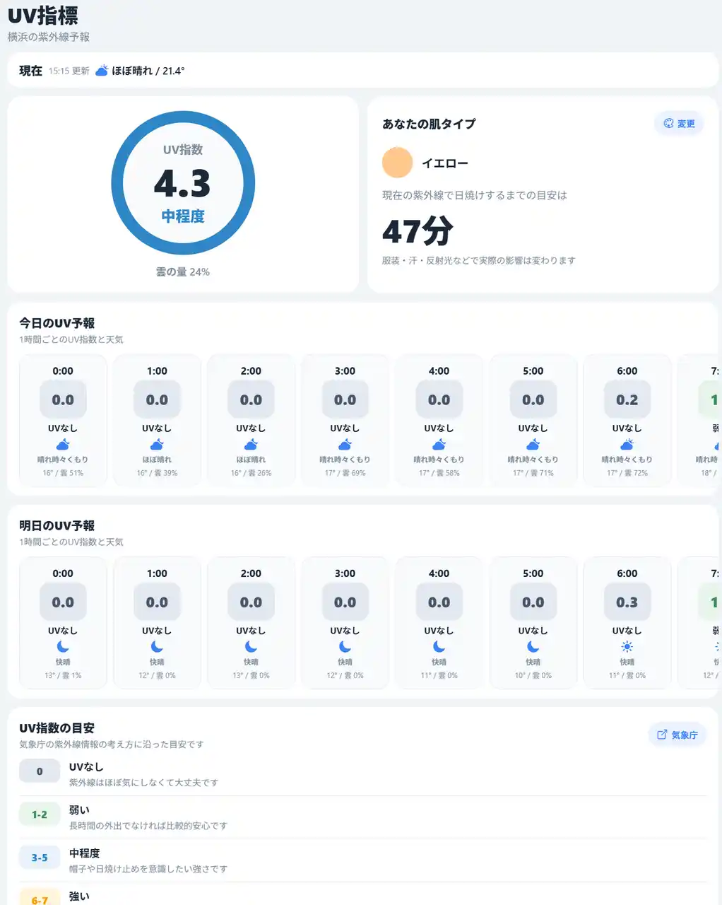 ・時間帯ごとの紫外線レベル確認 ・ユーザー毎の肌に応じた日焼けまでの目安確認 |