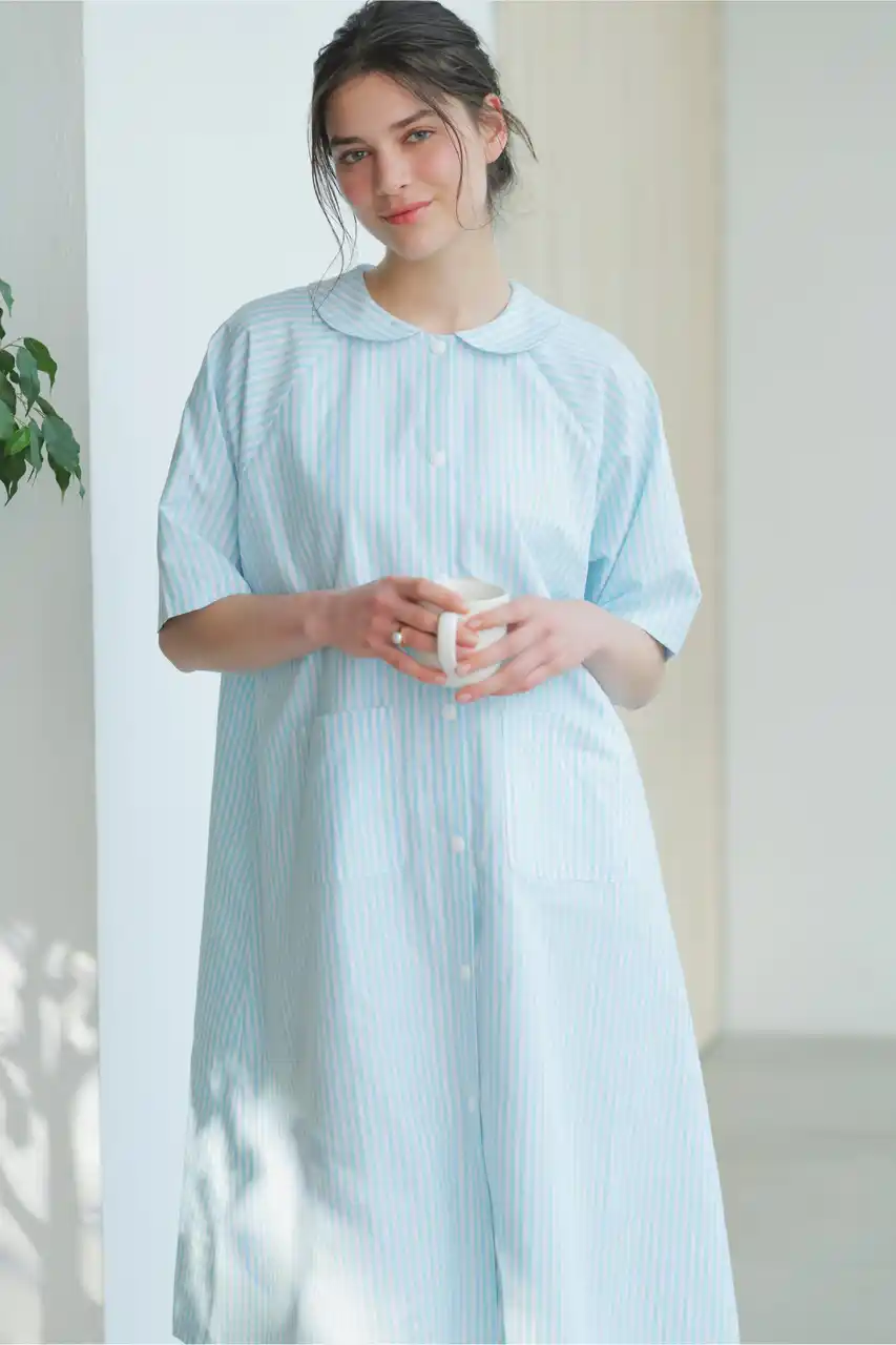 ◆丸襟ストライプ院内着 サイズ:M/L 展開色:アクア / オレンジ / ピンク |