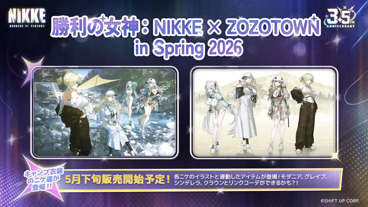 ZOZOTOWNとのコラボレーションも決定し、モダニア、クラウン、グレイブ、シンデレラといったキャラクターが春仕様の装いで登場予定です。各キャラクターのビジュアルと連動したアイテムが展開され、日常の中でも『NIKKE』の世界観を楽しめる取り組みとなっています。 |