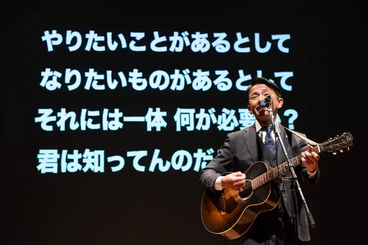 | 著書「人生で後悔しないために読んでおきたい88の言葉」を出版するほど、 「言葉」を大切にする彼ならではの熱いメッセージに、会場は感動と興奮に包まれました。自身の経験を交えたトークと、背中を後押しするライブパフォーマンスを通じ、新入生たちは「夢を言葉にする力」と「一歩踏み出す勇気」をしっかりと受け取っていました。 | |||||||||