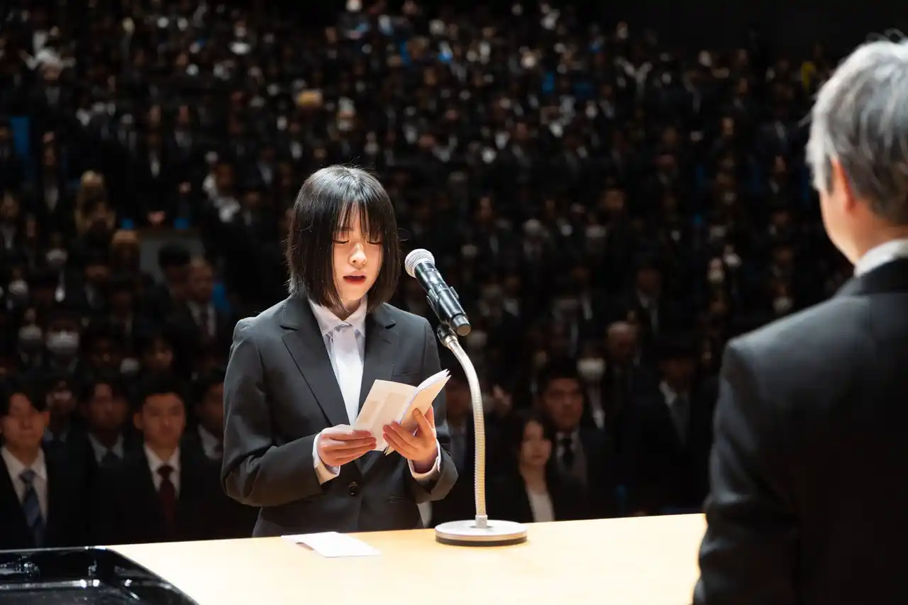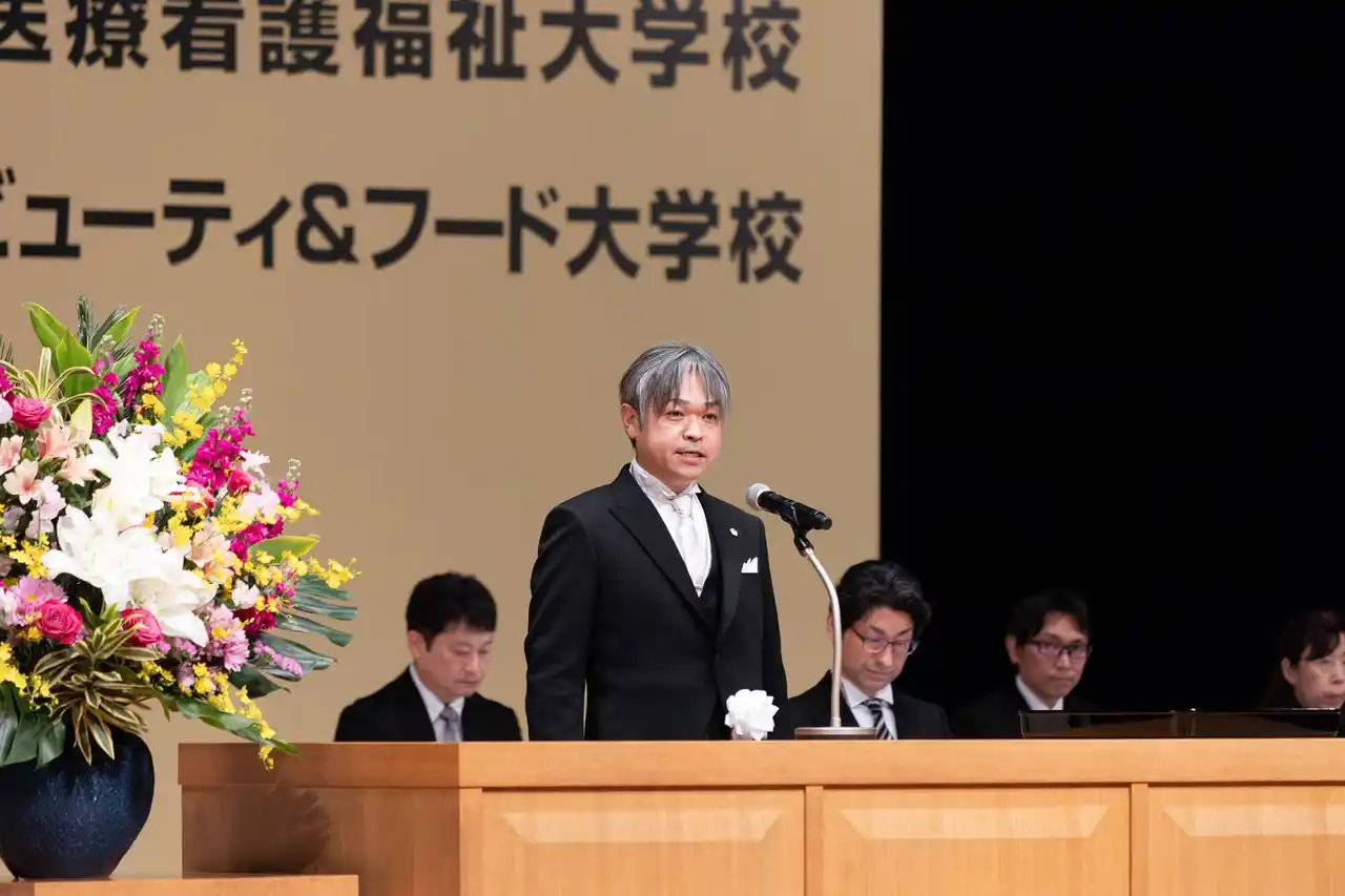 | 在校生代表の新妻悠華さん(国際医療看護福祉大学校臨床工学技士科2年)による歓迎の言葉を受け、新入生を代表して木村もえさん(国際アート&デザイン大学校グラフィックデザイン科3年制)が登壇。「努力を重ね、仲間と切磋琢磨しながら精進してまいります 」と、専門スキル習得への強い決意を力強く宣誓しました。 | |||||||||