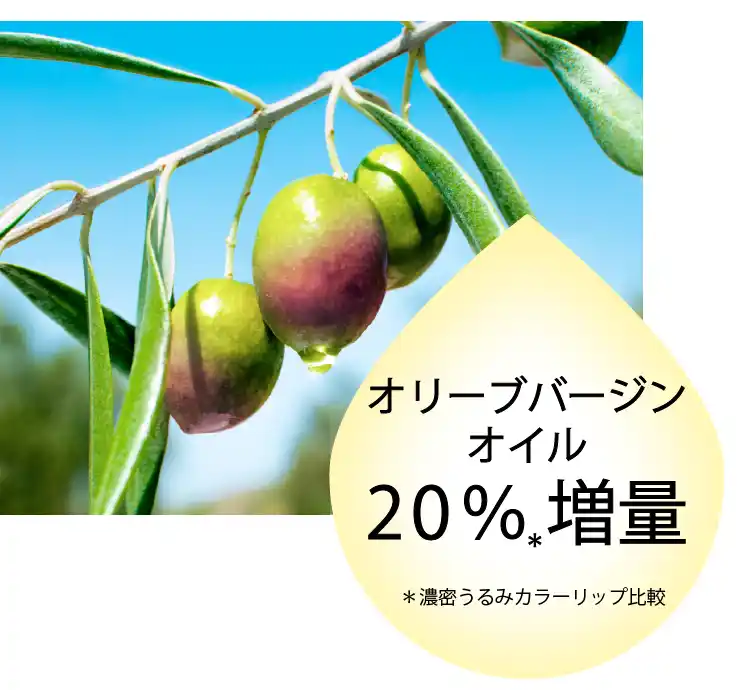 今回、リップクリームシリーズ共通保湿成分「オリーブバージンオイル」を20%※3増量で配合。さらに、ホホバオイル、スクワラン、ミツロウと天然由来の保湿成分と、水分を抱え込む性質を持つ「抱水性エモリエントオイル※4」を配合することで濃密な保湿とうるおいキープを実現します。 |