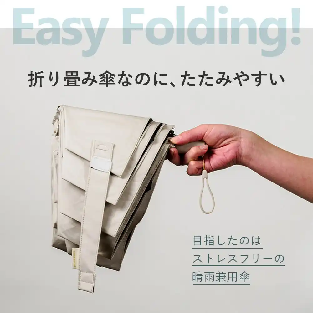 | 裏面加工のある生地でありながら、傘を閉じると折り目に沿って自然と整う設計を実現し、「晴雨兼用なのに、たたみやすい」折りたたみ傘を開発しました。 | |||||||||