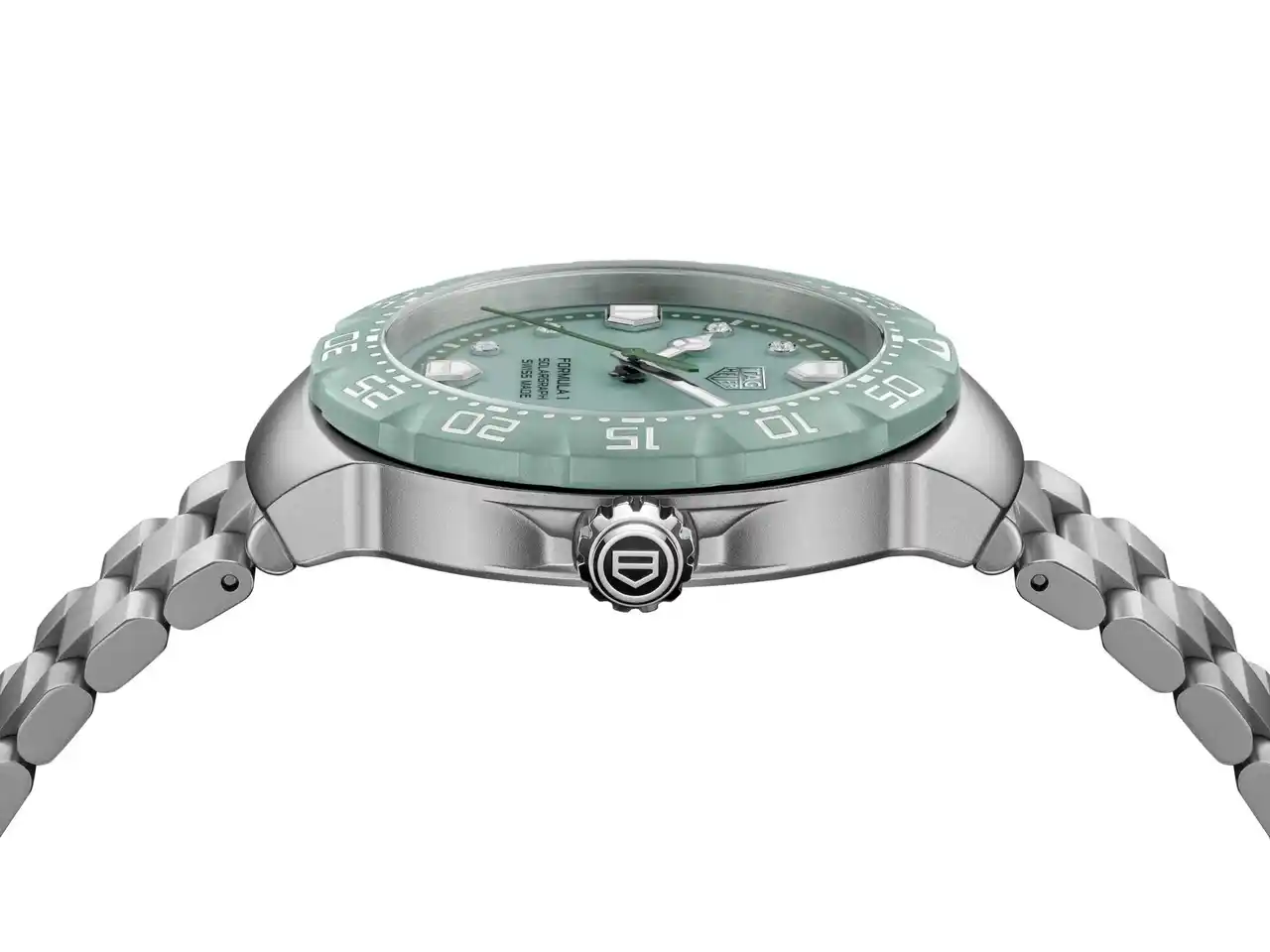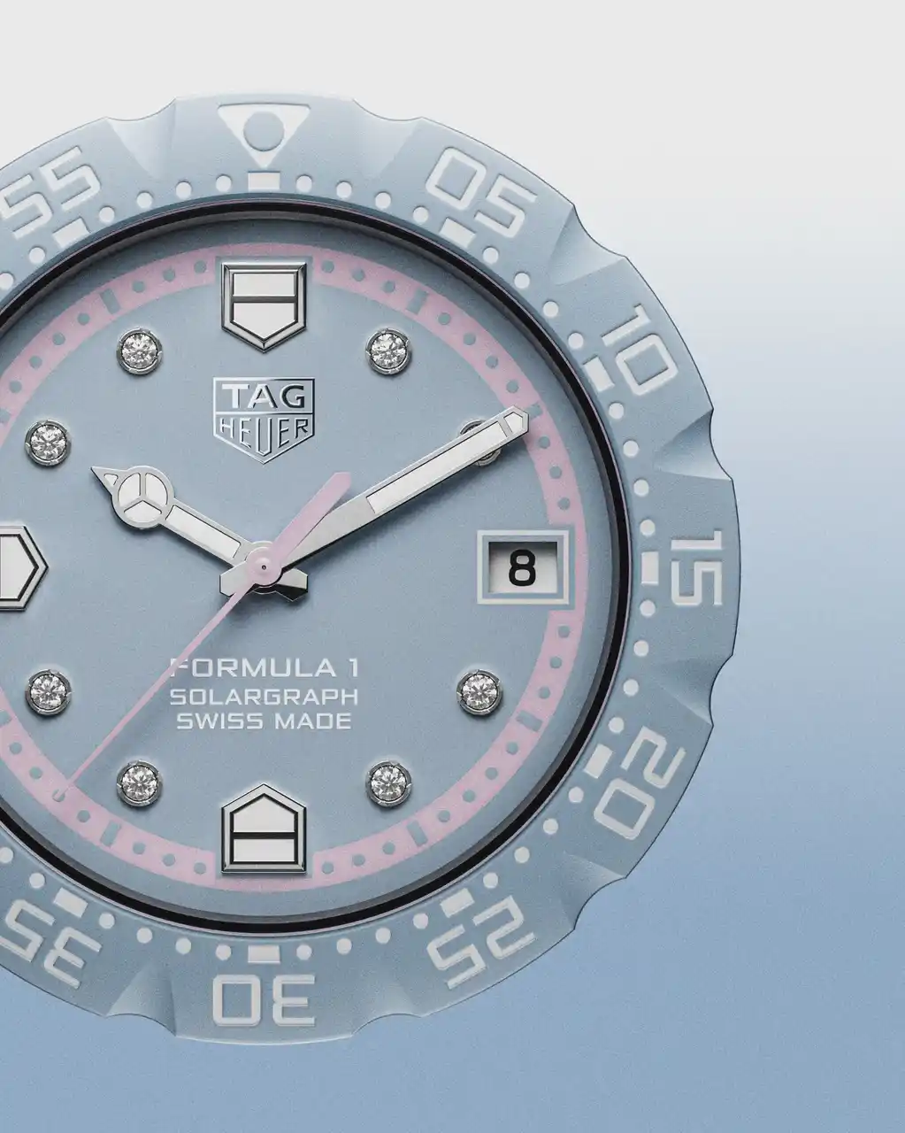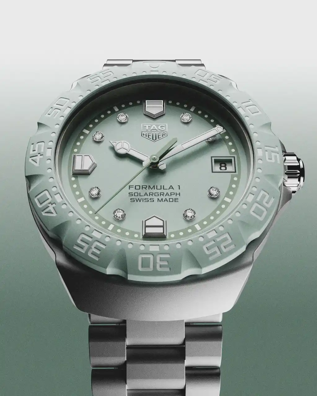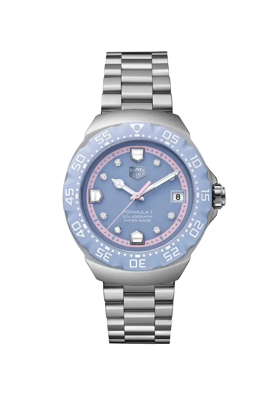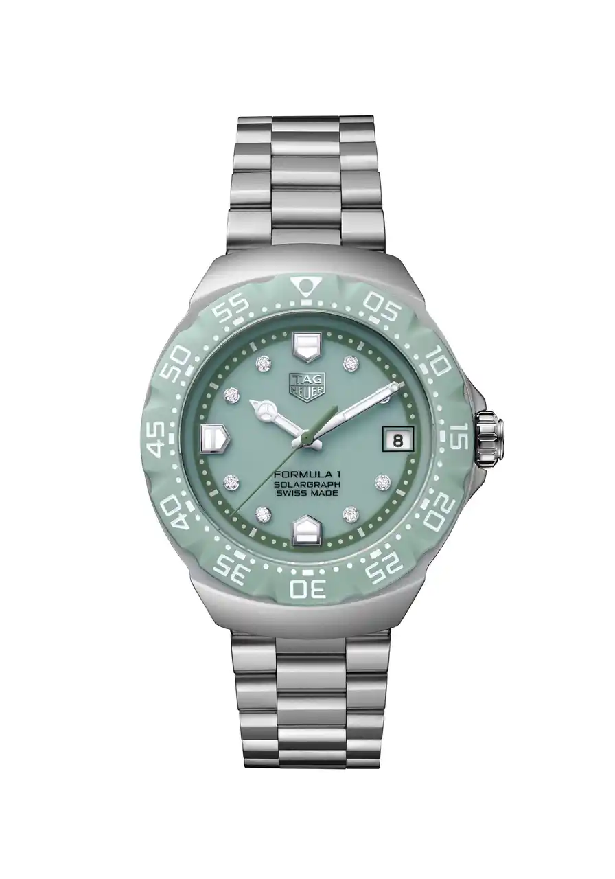 今回のコレクションでは、スポーティなダイナミズムとラグジュアリーなディテールを融合させた2つの洗練された解釈によるモデルも加わり、「タグ・ホイヤー フォーミュラ1 ソーラーグラフ」の世界観がさらに広がりを見せています。パステルグリーン、そしてラベンダーブルーを纏った2つのモデルは、ダイヤモンドをセットしたインデックスの繊細な輝きが際立ち、洗練を求める人にふさわしい気品を添えています。パステルグリーンのモデルが、現代的なカラーにまばゆいばかりに輝く煌きを組み合わせる一方、ラベンダーブルーのモデルは、パステルピンクのミニッツマーカーをアクセントに、ダイヤモンドをセットしたインデックスが光を捉え、奥行きと洗練されたコントラストを演出しています。 |
