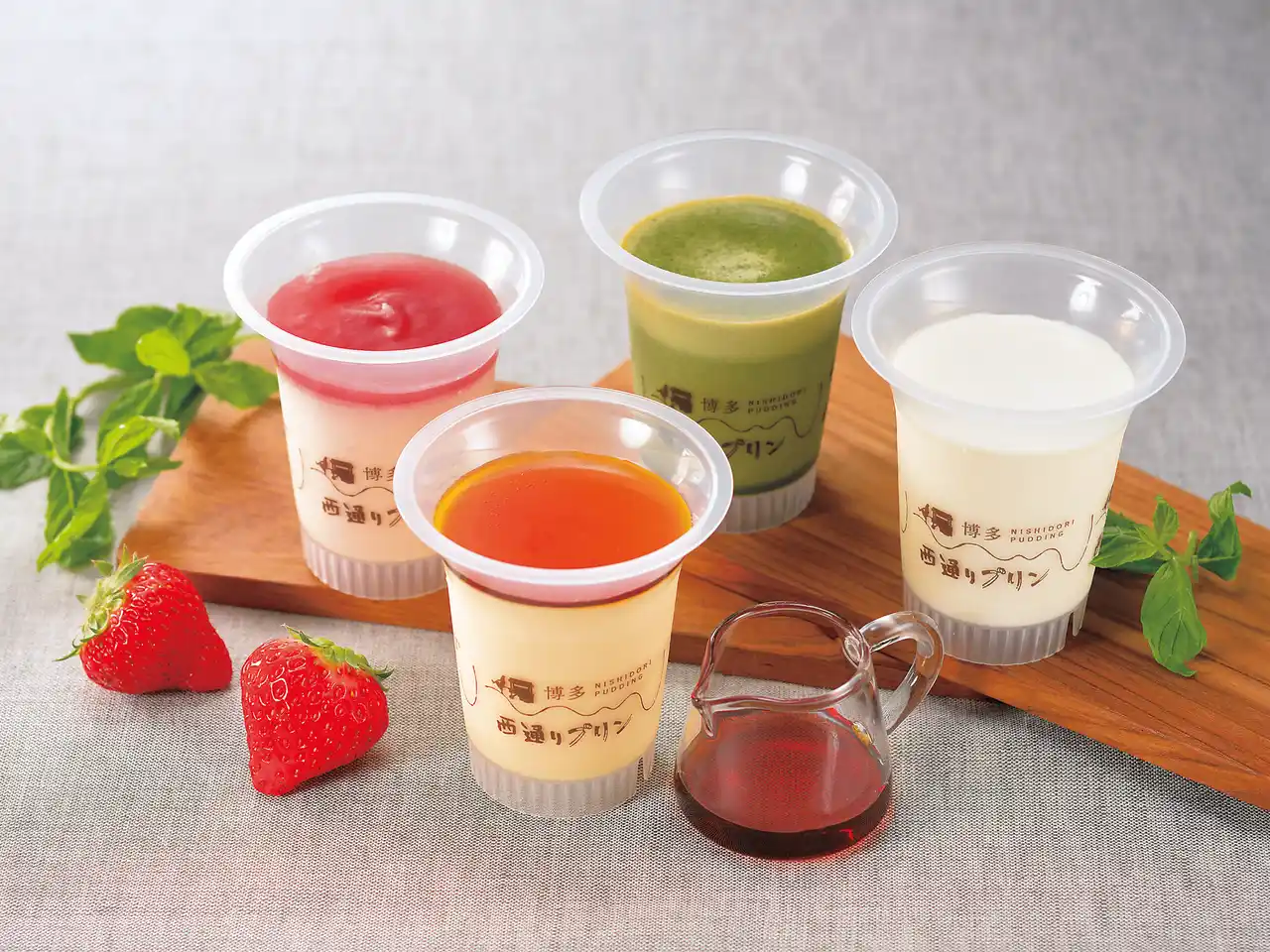 西通りプリンの味の原点であるカスタードプリンの「ポシェ」をはじめ、濃厚ミルクや八女茶、あまおうなど豊富な種類のプリンを取り揃えています。ぜひお気に入りの一品を見つけてください! |
