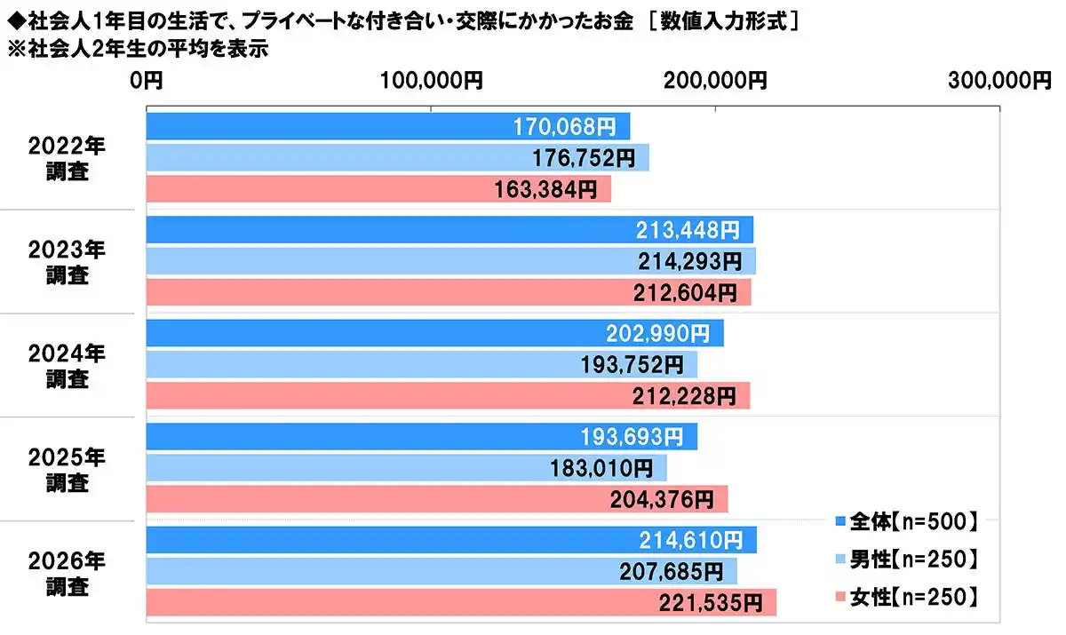 続いて、社会人2年生(500名)に、社会人1年目の生活で、プライベートな付き合い・交際にかかったお金を聞いたところ、かかった金額の平均は、全体では214,610円、男性では207,685円、女性では221,535円でした。 |