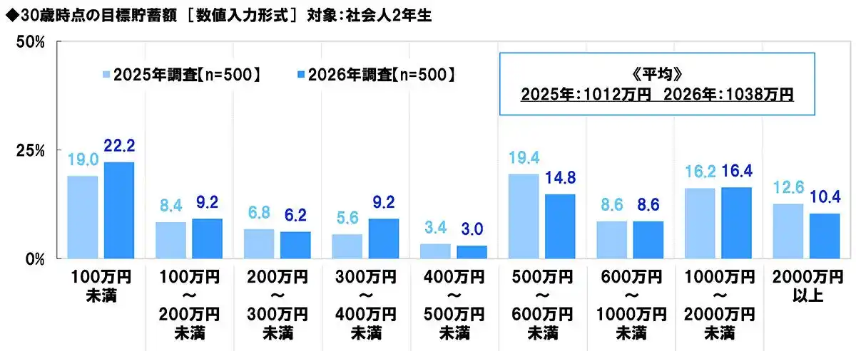 社会人2年生の30歳時点の目標貯蓄額について、昨年の調査結果と比較すると、目標貯蓄額の平均は、2025年1012万円→2026年1038万円と、26万円の増加となりました。 (図7) |
