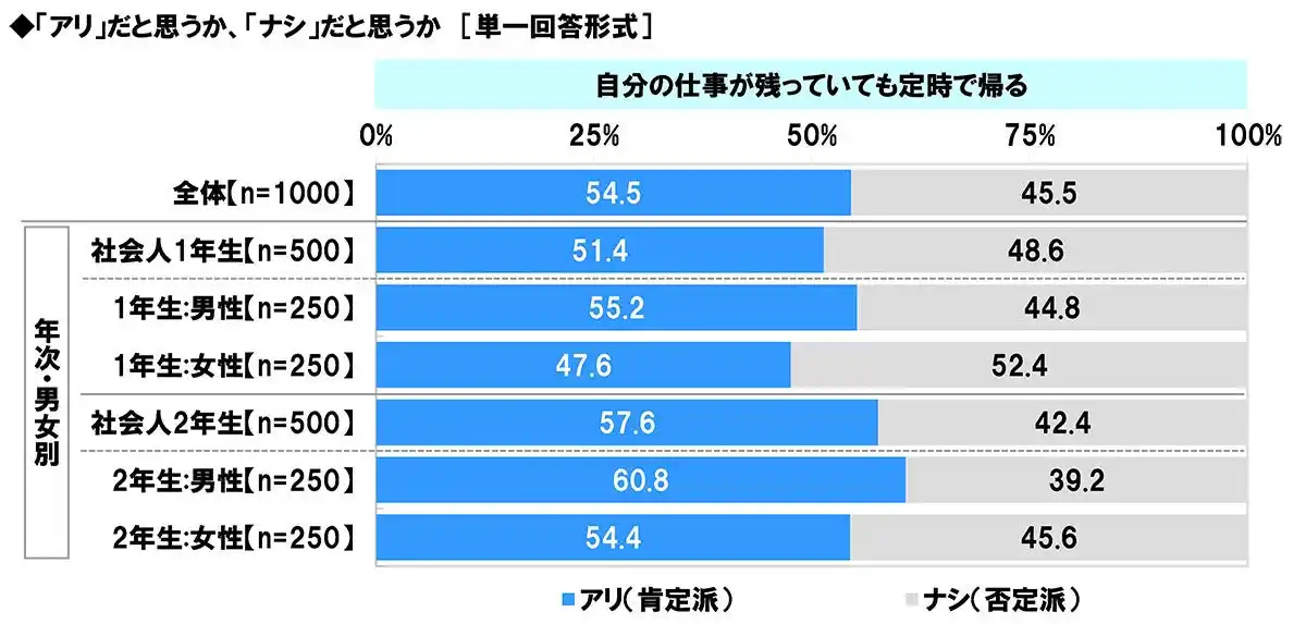 ◆“自分の仕事が残っていても定時で帰る” 社会人1年生・2年生の5割半が「アリ」と回答 社会人1年生の女性では「ナシ」が多数派 |