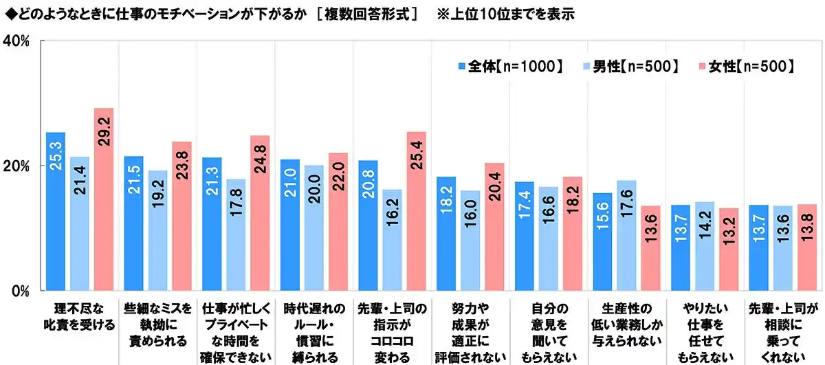 反対に、どのようなときに仕事のモチベーションが下がるか聞いたところ、「理不尽な叱責を受ける」(25.3%)が最も高くなり、「些細なミスを執拗に責められる」(21.5%)、「仕事が忙しくプライベートな時間を確保できない」(21.3%)、「時代遅れのルール・慣習に縛られる」(21.0%)、「先輩・上司の指示がコロコロ変わる」(20.8%)が続きました。理不尽な指導や指示を受ける場面などで、モチベーションが下がってしまう人が多いのではないでしょうか。 |