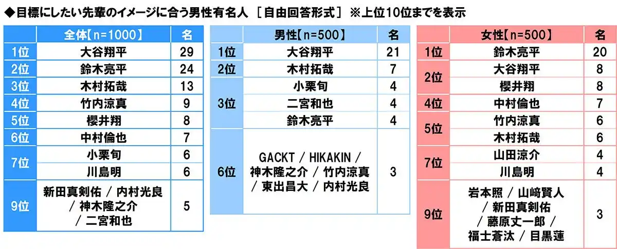 ◆目標にしたい先輩のイメージに合う男性有名人 男性回答1位「大谷翔平さん」、女性回答1位「鈴木亮平さん」 |