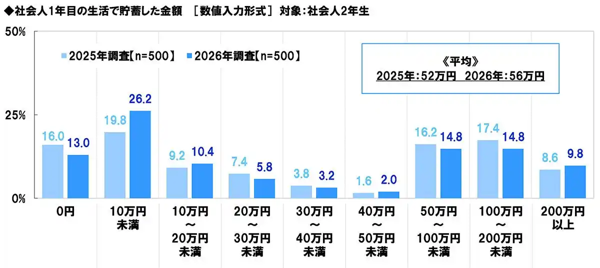 昨年の調査結果と比較すると、社会人1年目の生活で貯蓄した金額の平均は2025年52万円→2026年56万円と、4万円の増加となりました。 (図5) |