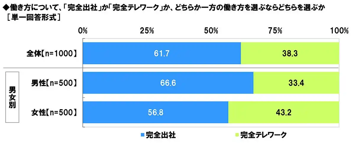 全回答者(1,000名)に、「完全出社」か「完全テレワーク」か、どちらか一方の働き方を選ぶならどちらを選ぶか聞いたところ、「完全出社」は61.7%、「完全テレワーク」は38.3%となりました。 |