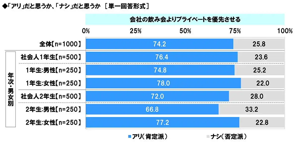 ◆“会社の飲み会よりプライベートを優先させる” 社会人1年生・2年生の7割半が肯定派 社会人2年生の男性では6割半にとどまる |