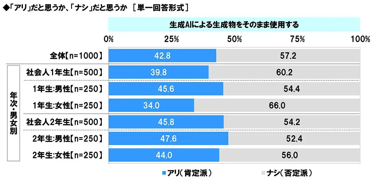 ◆“生成AIによる生成物をそのまま使用する” 肯定派は社会人1年生・2年生の4割強 社会人1年生の女性では3割半にとどまる |