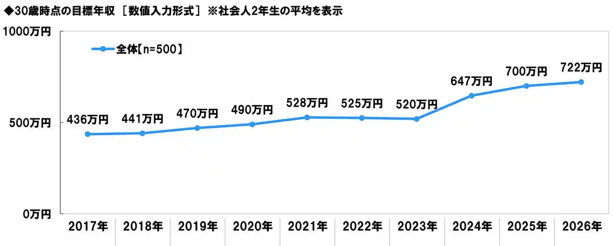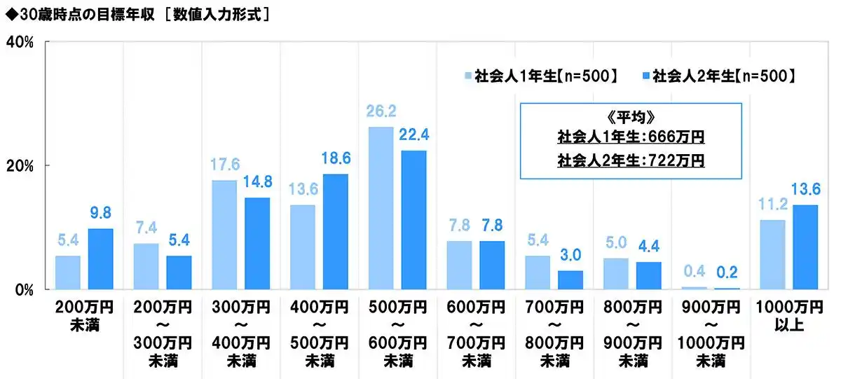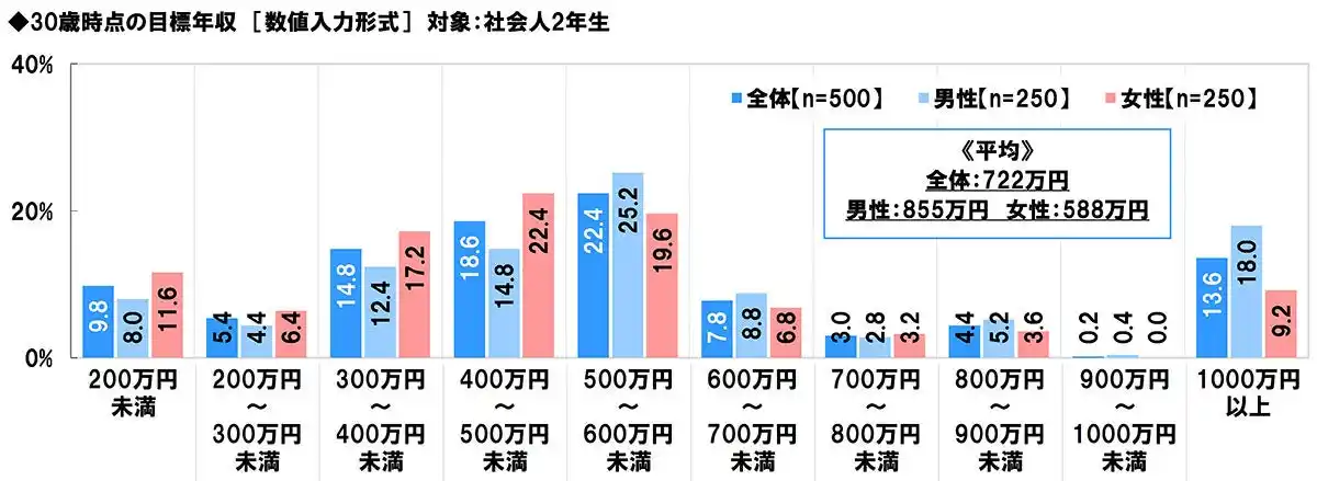 ◆30歳時点の目標年収 社会人1年生では平均666万円、社会人2年生では平均722万円 社会人2年生の女性は平均588万円、昨年調査から45万円増加 |