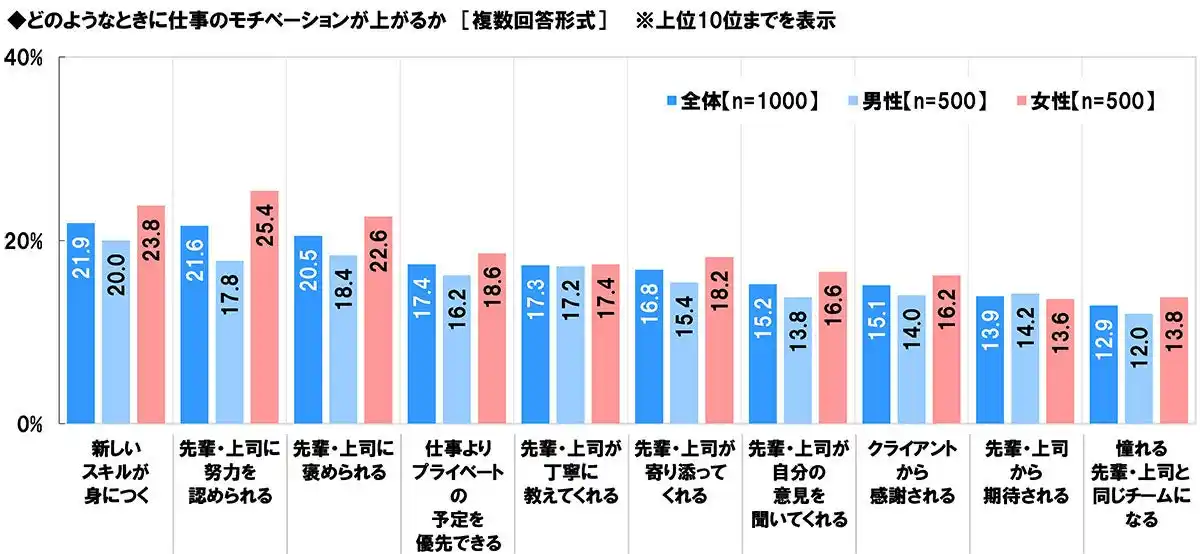 全回答者(1,000名)に、どのようなときに仕事のモチベーションが上がるか聞いたところ、「新しいスキルが身につく」(21.9%)が最も高くなり、僅差で「先輩・上司に努力を認められる」(21.6%)、「先輩・上司に褒められる」(20.5%)が続きました。自身の成長の実感や、先輩や上司からの評価で意欲的になる人が多いようです。以降、「仕事よりプライベートの予定を優先できる」(17.4%)、「先輩・上司が丁寧に教えてくれる」(17.3%)となりました。 |