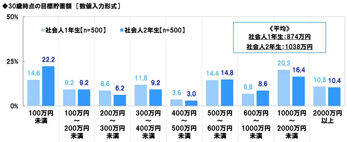 ◆30歳時点の目標貯蓄額 社会人1年生では平均874万円、社会人2年生では平均1038万円」 |
