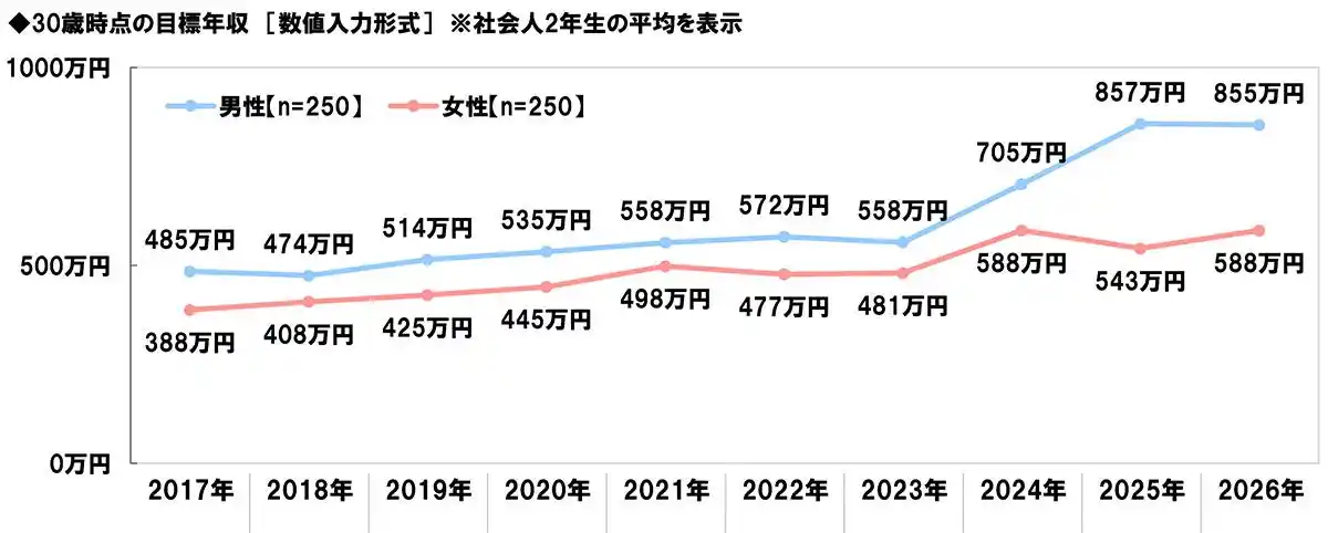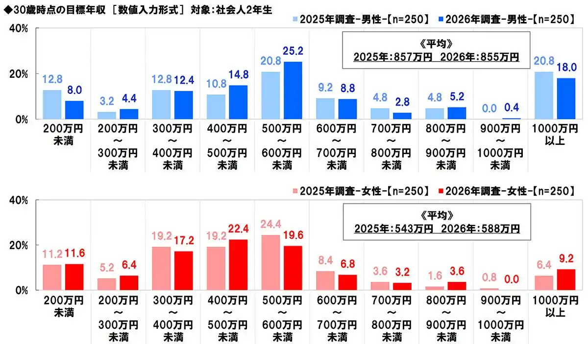 社会人2年生の30歳時点の目標年収について、男女別にみると、平均は男性855万円、女性588万円となりました。 (図9) |