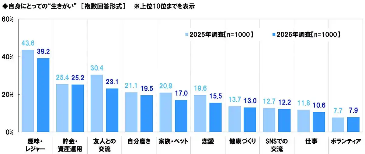全回答者(1,000名)に、自身にとっての“生きがい”を聞いたところ、1位「趣味・レジャー」(39.2%)となり、次いで、2位「貯金・資産運用」(25.2%)、3位「友人との交流」(23.1%)、4位「自分磨き」(19.5%)、5位「家族・ペット」(17.0%)となりました。 |