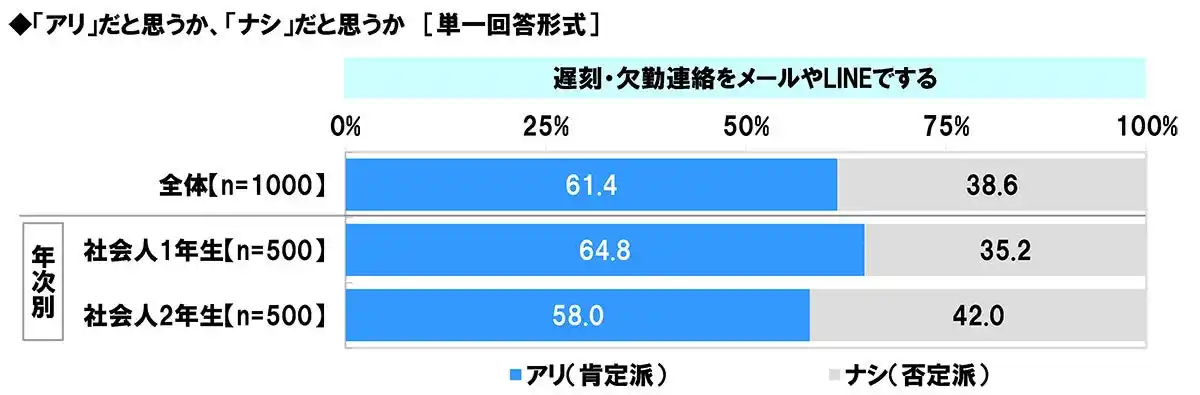 全回答者(1,000名)に、職場での行動について、それぞれ社会人として「アリ」だと思うか、「ナシ」だと思うか聞いたところ、≪遅刻・欠勤連絡をメールやLINEでする≫では「アリ」は61.4%、「ナシ」は38.6%と、肯定派が多数となりました。 |