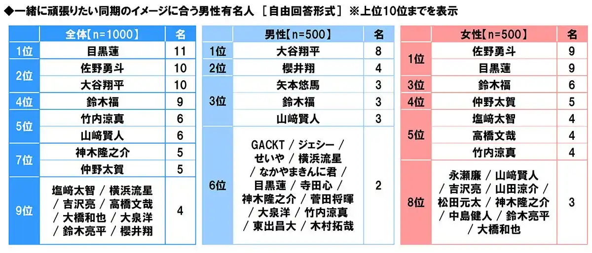 ・一緒に頑張りたい同期のイメージに合う男性有名人 男性回答1位「大谷翔平さん」、女性回答1位「佐野勇斗さん」「目黒蓮さん」 |