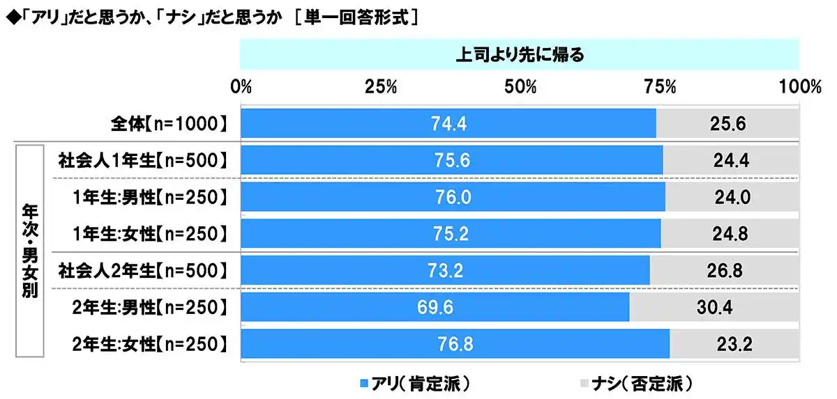 ◆“上司より先に帰る” 社会人1年生・2年生の7割半が「アリ」と回答 |