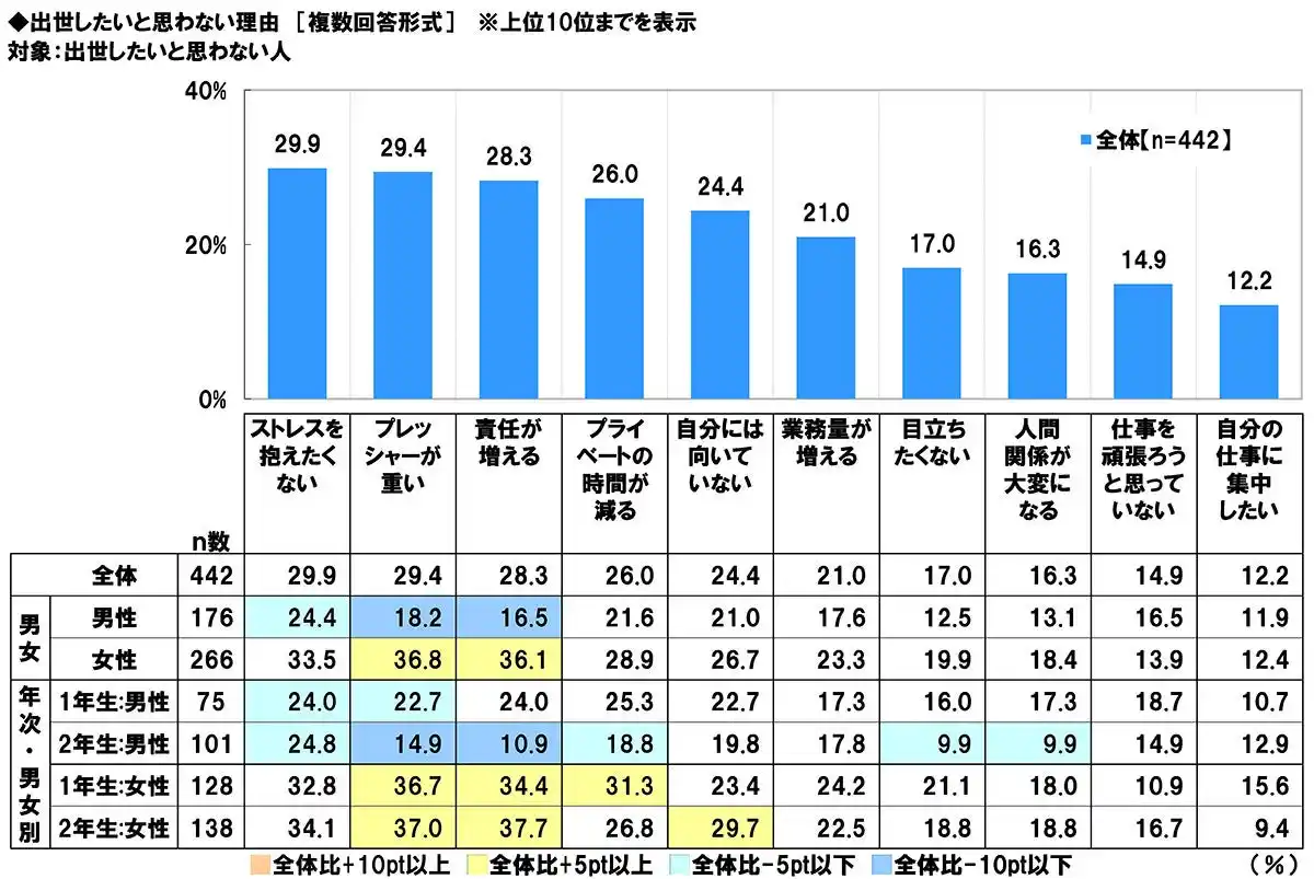 男女別にみると、男性では「ストレスを抱えたくない」(24.4%)と「プライベートの時間が減る」(21.6%)がTOP2、女性では「プレッシャーが重い」(36.8%)と「責任が増える」(36.1%)がTOP2となりました。 |