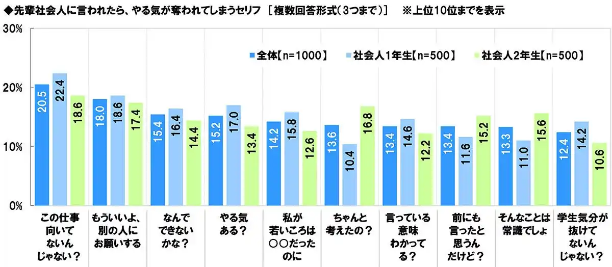 ・社会人1年生・2年生が先輩に言われたらやる気を奪われるセリフ 1位「この仕事向いてないんじゃない?」2位「もういいよ、別の人にお願いする」 |