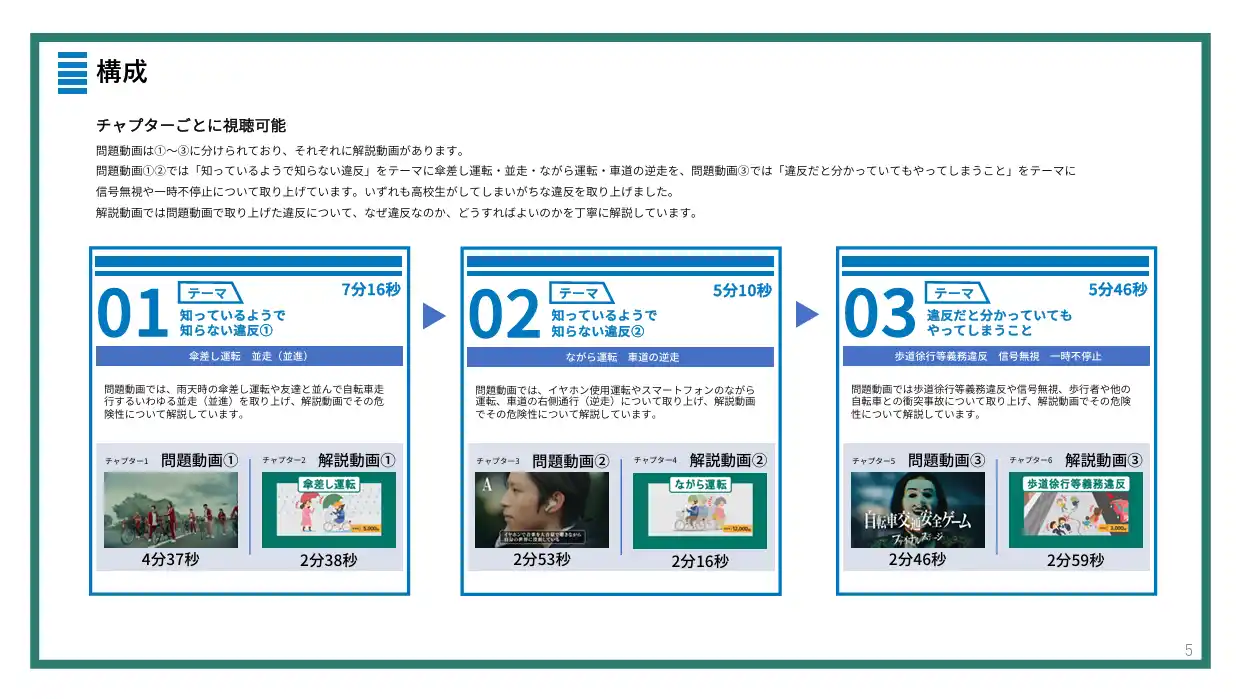 | ドラマ仕立ての動画を視聴し、併せて付属資料を活用して授業を行うことで、交通ルールを守る重要性や、日常の何気ない行動に潜む危険を正しく理解できるようになるミステリーゲーム風のコンテンツ。日ごろから交通事故の未然防止活動に取り組んでいるJA共済が、令和8年4月から、自転車へ「交通反則通告制度(通称:青切符)」が導入されることを機に未来を担う若者の健全な育成と安全な環境づくりに貢献することを目的に製作した。 | |||||||||||||||||||||