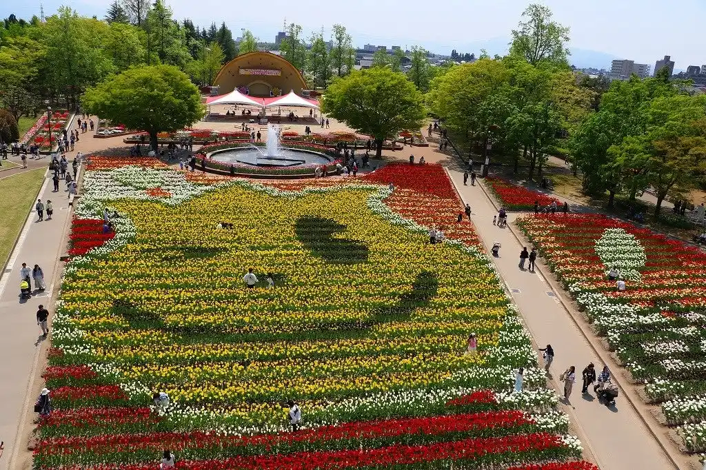 チューリップタワーやチューリップスカイウォークから一望できる大花壇の地上絵は必見。 |