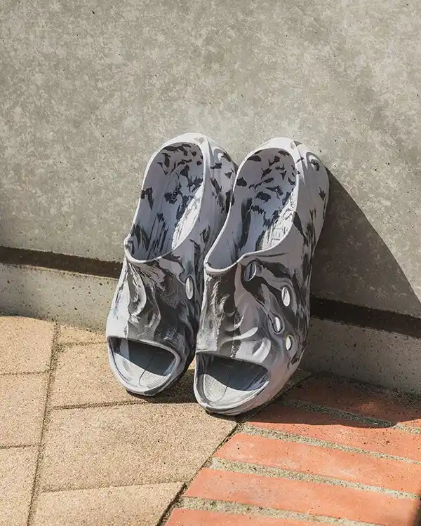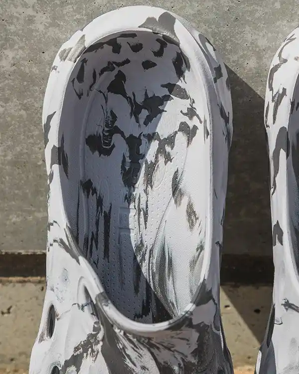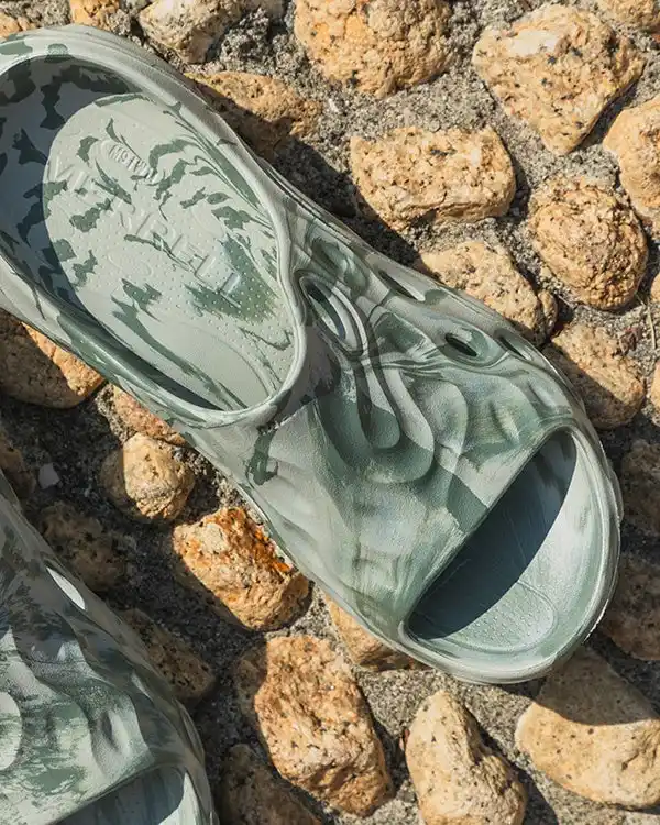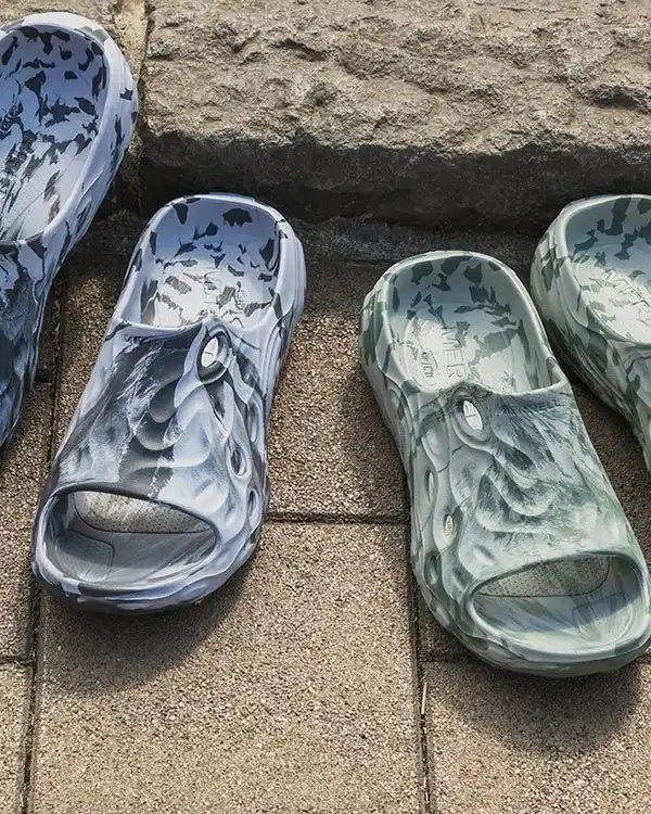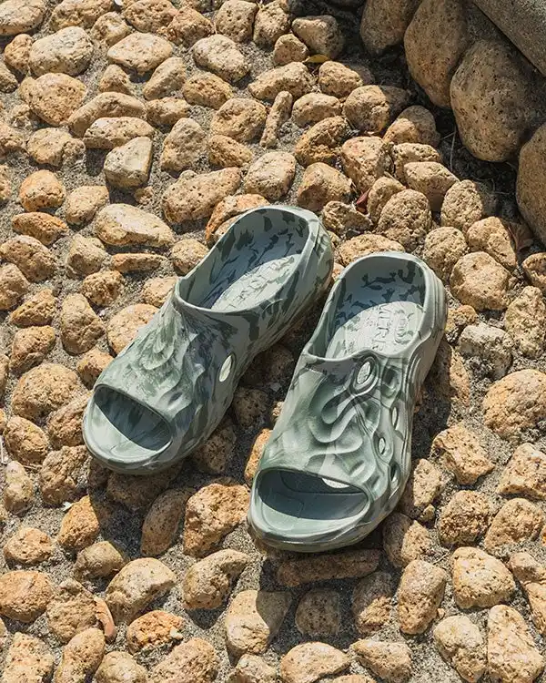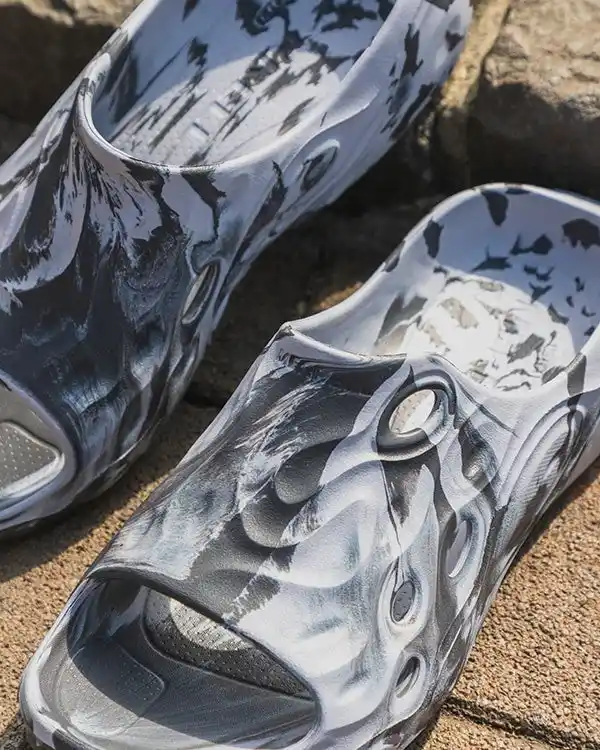 | アッパーフォルムのコンセプトは『Water Flowing over Rocks(岩の上を流れる水の動き)』をイメージしています。アッパー素材には藻類バイオマスから生成されたサステナブル素材「BLOOM」フォームを採用し、またスライド仕様でスムーズに着脱していただけます。 | |||||||||