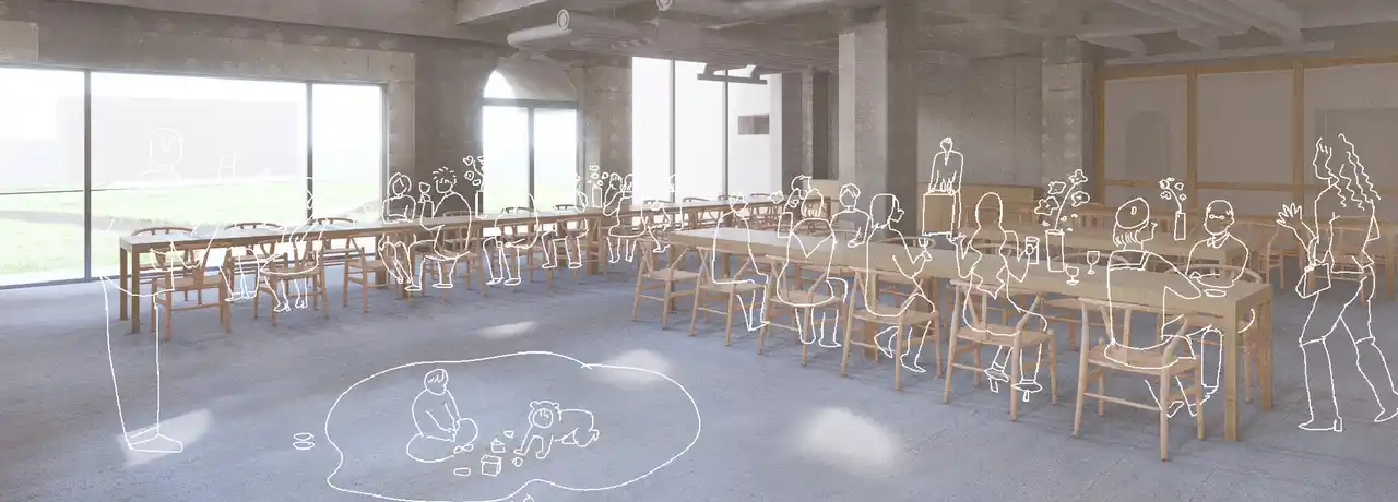 訪れる人の過ごし方に合わせて、空間のかたちも変わる多目的スペース「ホール」。誰もが気軽に腰を下ろし、会話を楽しみ、大人数で賑やかに集う宴会の場としても。時には得意なことや好きなことを誰かに伝える、新たな挑戦の場にもなります。決まった使い方に当てはめるのではなく、目的に合わせそれぞれの時間や過ごし方の中で、自然と居場所が生まれていく 空間を目指します。 |