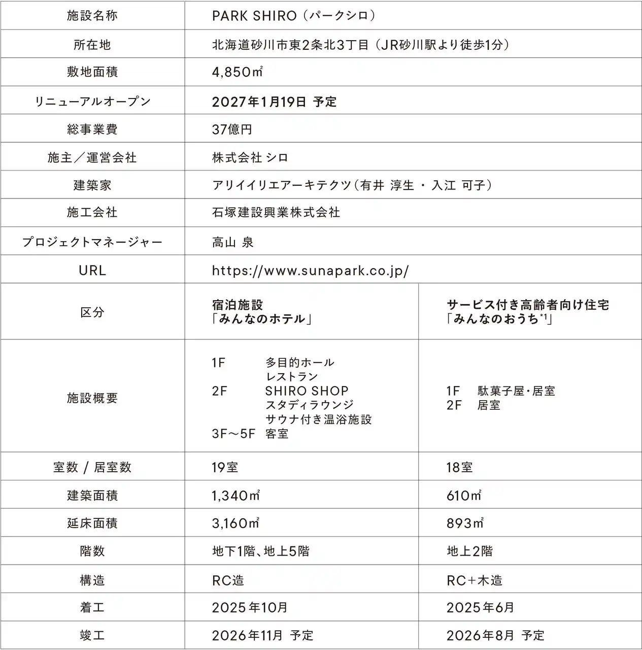 株式会社シロは、2027年1月19日(火)に砂川パークホテルの名称を『PARK SHIRO』へと変え、リニューアルオープンします。『PARK SHIRO』は宿泊施設「みんなのホテル」と、サービス付き高齢者向 け住宅「みんなのおうち*1」で構成され、ブランド初となる“セカンドハンド”をテーマとした新しいかたちのショップも併設します。「みんなのホテル」には5タイプ19室のほか、温浴施設やレストラン、多目的ホールを計画。サービス付き高齢者向け住宅「みんなのおうち*1」には、敷地内に駄菓子屋をオープンするなど、それぞれの場を開き、訪れる人にとっても、暮らす人にとっても、日常の居場所になることを目指します。 |