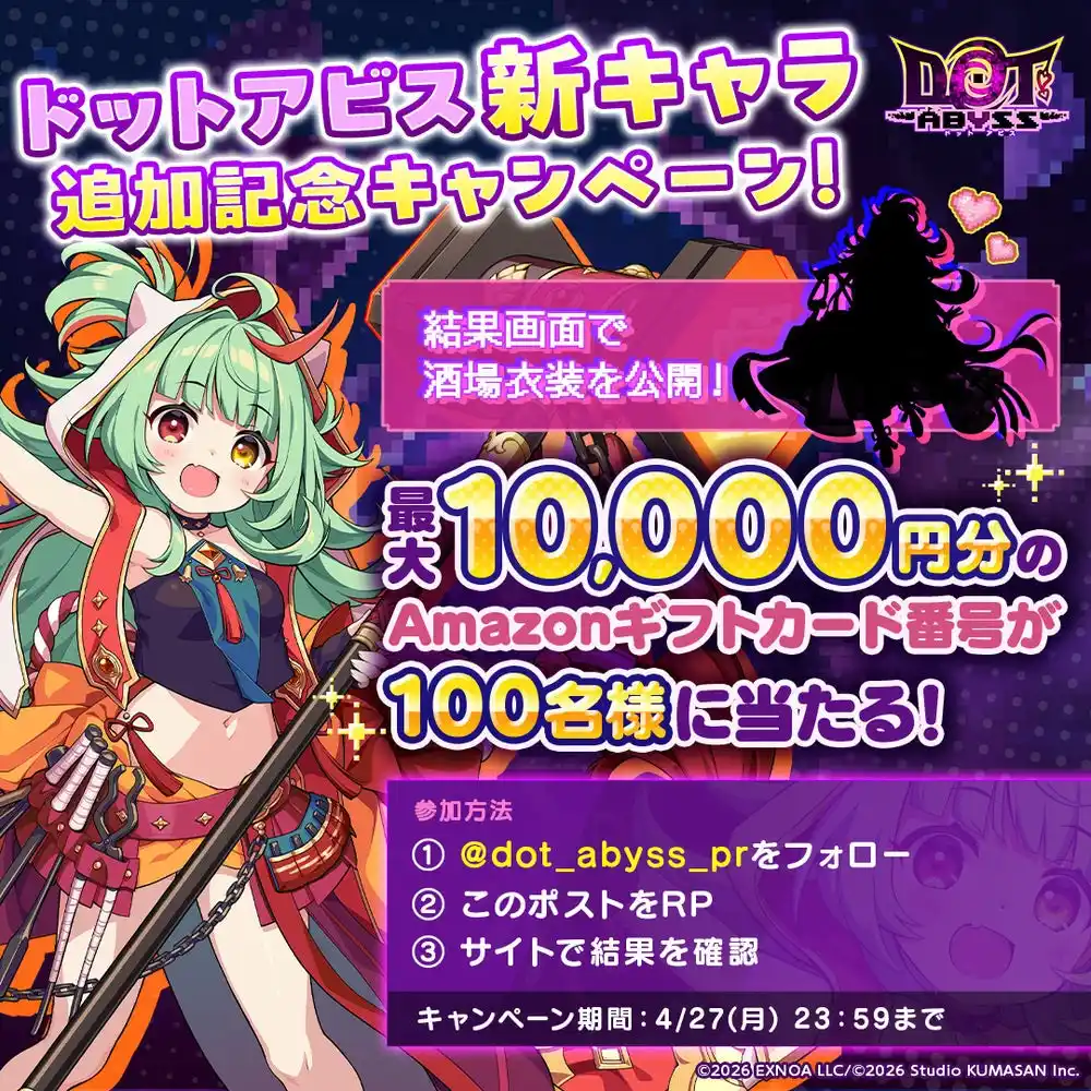 『ドットアビス』公式Xにて事前登録ガチャに新キャラクターのSSR「ホノカ」追加を記念したフォロー&リポストキャンペーンを開催中です。 |