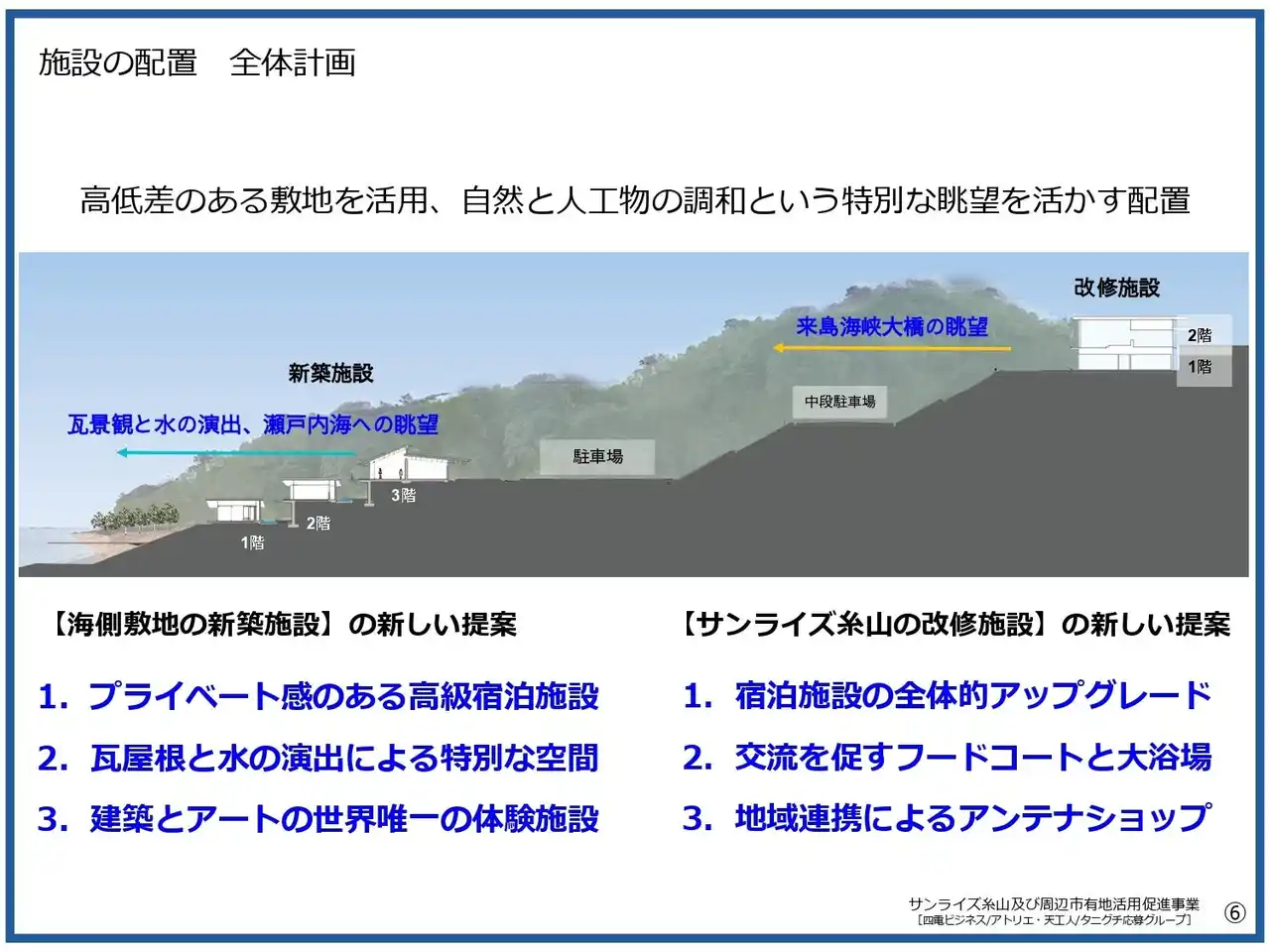| 今治市では、年々増加するしまなみエリアを訪れる観光客を地域全体の観光消費や宿泊需要につなげ、市内での滞在時間を延ばしていくことが課題となっていました。こうした課題の解決に向けて、地域資源を生かした体験価値を創出する拠点として、「サンライズ糸山及び周辺市有地活用促進事業」がスタートしました。 | |||||||||||||||||||||