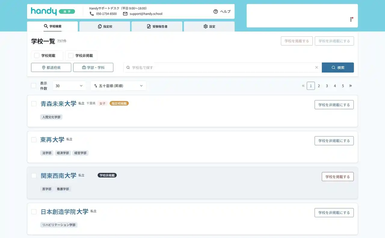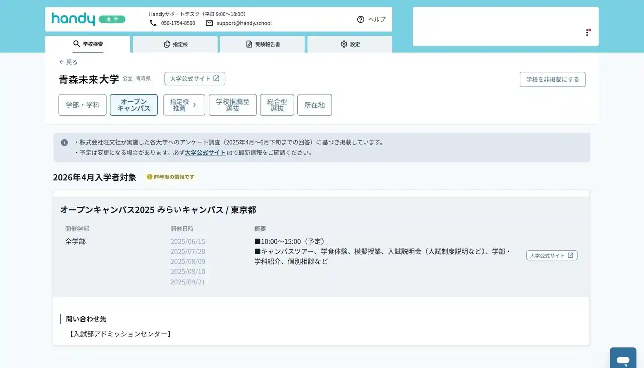 本サービスは継続的な機能拡充を予定しており、今夏を目処に「一般選抜」に関する入試情報の追加掲載を計画しております。これにより、指定校推薦やその他の年内入試にとどまらず、一般選抜に至るまで年間を通じたあらゆる入試情報をHandy上で網羅的に検索・管理できる環境を実現し、生徒の多様な進路選択をさらに強力にサポートしてまいります。 |