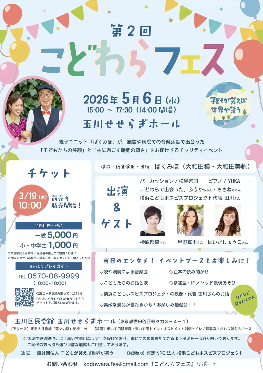 | 一般社団法人 子どもが笑えば世界が笑う(代表:大和田美帆)は、2026年5月6日(水・振替休日)、玉川区民会館せせらぎホールにて、チャリティーイベント「こどわらフェス」を開催いたします。本イベントは、病気や障がいとともに生きる子どもたちやご家族の存在を広く社会に伝え、エンターテインメントを通して、誰もが楽しみながら学び、つながる場を目指す社会的活動です。チケット売上の利益は全て、小児がんの子どもたちなどが家族と過ごす施設・横浜こどもホスピスへ寄付されます。 | ||||||||||||||