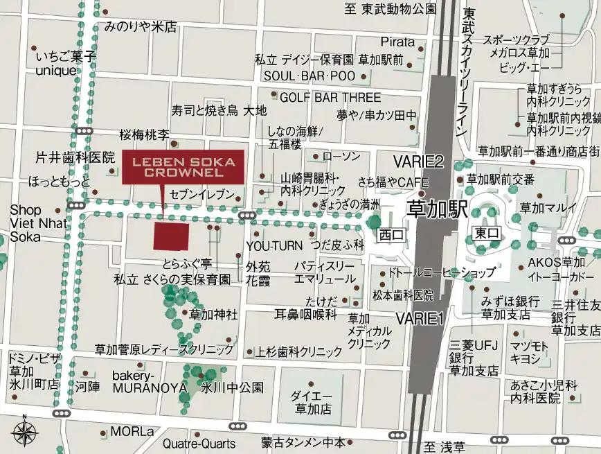 多様な大型商業施設が徒歩6分圏内に充実している点も本物件の魅力の一つです。駅直結の「草加VARIE」(徒歩4分)や「ダイエー草加店」(徒歩5分)をはじめ、「イトーヨーカドー草加店」(徒歩6分)や「草加マルイ」(徒歩6分)が入店する「AKOS」(徒歩6分)など、日々の買い物に便利な商業施設が多数集積しております。加えて、周辺にはコンビニエンスストア、ドラッグストア、豊かな公園、多数の教育施設、そして医療施設も近接しており、日々の生活をより豊かにする住環境が整っています※4。 |