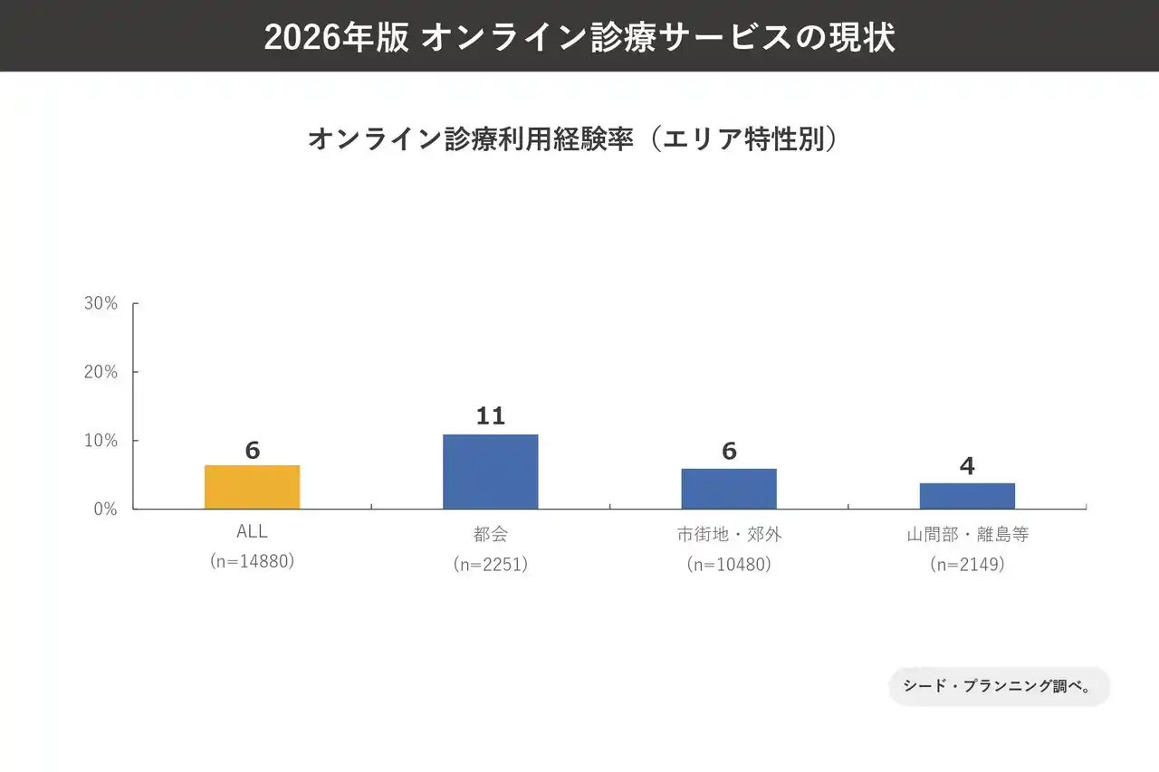 オンライン診療は、都会で利用経験が先行している構図がみられます。都会で経験率や継続利用が高い背景には、サービス自体の認知度に加え、対象となる医療機関や自由診療サービスとの接点、スマートフォン決済や予約アプリへの慣れといった要素がそろいやすいことが考えられます。また、都市部では忙しい生活者が多く、通院時間の短縮や待ち時間の削減といった利便性が価値として受け入れられやすい可能性があります。 |