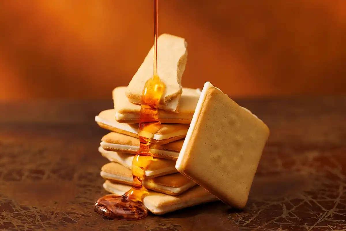 メープルシュガーを生地に練りこみ、サクサクのクッキーでバター風味のチョコ ※ をサンド。 |
