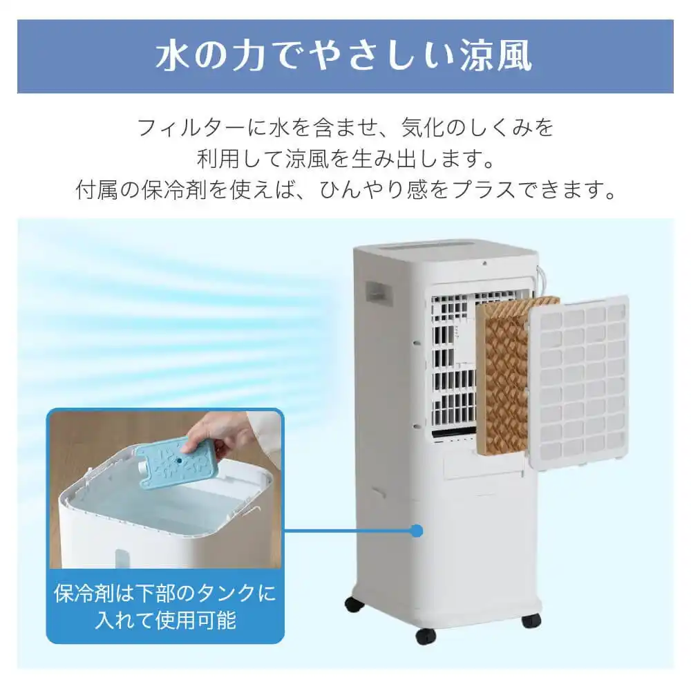 水の力でやさしい涼風、風量は送風・涼風3段階、温風2段階で調整可能 |