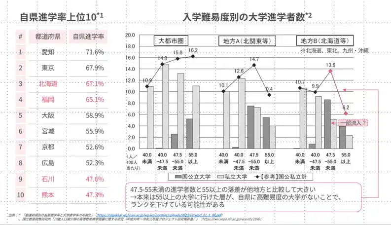 出典:*1 「都道府県別の自県進学率と大学進学率の可視化」(https://cdgakkai.ws.hosei.ac.jp/wp/wp-content/uploads/2023/12/sgcd_21_1_08.pdf) *2 国立教育政策研究所「18歳人口減少期の高等教育進学需要に関する研究(平成30年~令和元年度プロジェクト研究報告書)」(https://nier.repo.nii.ac.jp/records/1890) |